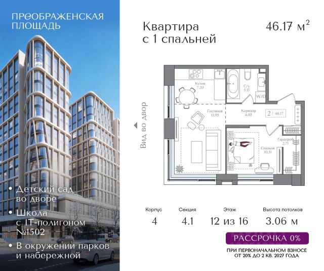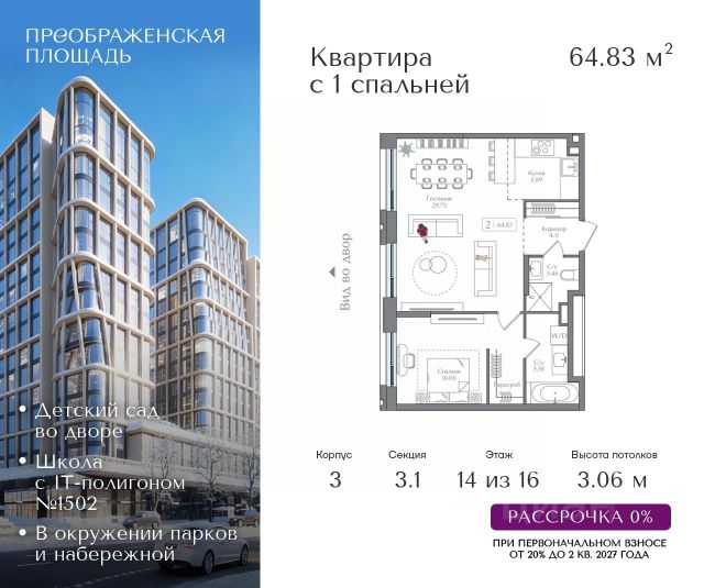 Рассрочка 0% от застройщика. Первоначальный взнос от 20%. Предложение действует до 31 января 2026 года Квартира на 5 этаже в жилом комплексе премиум-класса "Преображенская площадь". Общая площадь: 57.31 кв.м. Проект премиум-класса в историческом районе Москвы. До метро "Преображенская площадь" 3 минуты пешком. Квартиры сдаются без отделки и в свободной планировке, чтобы жители могли оформить пространство с учетом своей индивидуальности. Высота потолков от 3,15м, широкоформатное остекление, 3-5 квартир на этаже. Система Умный дом. Дизайнерские лобби. Внутренний двор 1,5 га функциональное и безопасное пространство для игр, работы и занятий спортом. Пешеходный променад для прогулок. Дома переменной этажности. Есть подземный паркинг. Жилой комлекс находится в окружении парков Сокольники, Черкизовский, Измайловский, заповедника Лосиный остров и ВДНХ, а также вблизи пешеходной набережной. Комфортная удаленность от центра: 7 минут на автомобиле до ТТК, 8 минут до Садового кольца, 25 минут до Кремля.
