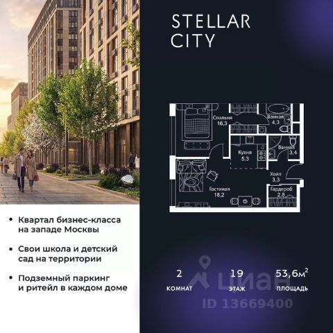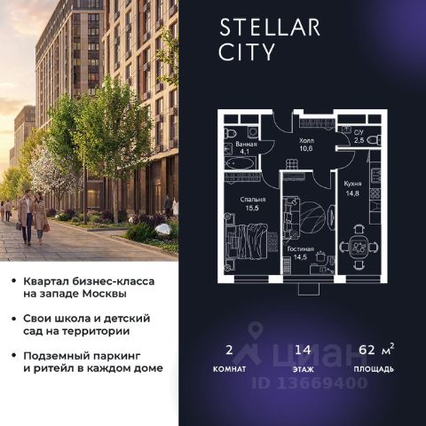 Продается квартира от надежного застройщика Tashir Estate в квартале бизнес-класса Stellar City в ЗАО Москвы. Площадь квартиры составляет: 61.2 кв. м, потолки: 3.1 м Квартира находится на 6 этаже, 4 корпуса жилого квартала Stellar City — микрогорода будущего на орбите Москвы. Stellar City — квартал в ЗАО Москвы вблизи инновационного центра Сколково. В окружении — 11 парков и природных зон, в том числе Долина реки Сетунь, Мещерский лес и парк развлечений The Rink. Город в городе Чтобы дом и инфраструктура вокруг отвечала динамичному лайфстайлу жителя мегаполиса, в основу проекта легла концепция город в городе, которая позволяет решать все бытовые вопросы in-home. В квартале будут возведены школа и детский сад, воркаут-зоны, променад, вело и беговые дорожки, детские площадки для каждого корпуса, а также коммерция на первых этажах для ежедневных покупок. Все необходимое — на расстоянии нескольких шагов. Изящные и лаконичные лобби Авторский дизайн, натуральные материалы в отделке и безупречный интерьер вне времени. Лобби и холлы в проекте бизнес-класса Stellar City ничем не отличаются от входных групп в премиум-сегменте благодаря качественным европейским материалам в отделке, стильному дизайну, консьерж-сервису и уютной зоне ожидания с журнальными столиками и мягкой мебелью. Комфорт и безопасность Закрытая территория, охрана, система СКУД, специально разработанное мобильное приложение дома для резидентов и подземный паркинг с круглосуточным наблюдением и доступом с помощью автоматического считывания номера авто.