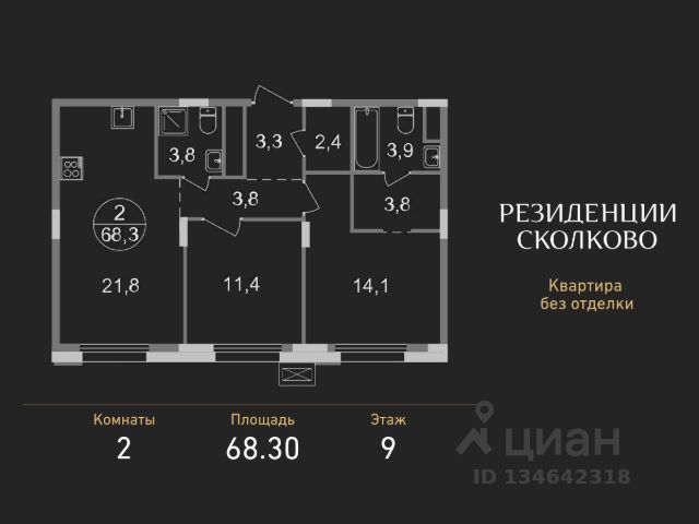 Продается двухкомнатная квартира без отделки в девятиэтажном монолитном доме жилого комплекса "Резиденции Сколково". Общая площадь квартиры - 73,4 кв. м, этаж 8 из 9. Срок сдачи - 2 квартал 2027 года. ТОЛЬКО ДО 30 АПРЕЛЯ выгодные условия на приобретение квартиры в ипотеку или рассрочку. Звоните - и мы подберем оптимальное предложение под ваш запрос! Резиденция 2.2 состоит из 6 секций: - 5 секция с отделкой White Box с возможностью повышения до дизайнерской за дополнительную плату - Остальные секции - без отделки ЖК "Резиденции Сколково" - это современный проект бизнес-класса, расположенный в престижном районе Сколково, у западной границы Москвы. ТРАНСПОРТНАЯ ДОСТУПНОСТЬ: - 0 км от МКАД - 10 минут на личном авто до метро "Озёрная" Солнцевской линии - 15 минут на личном авто до Москва-Сити по Кутузовскому проспекту - 20 минут на личном авто до центра по проспекту Генерала Дорохова - 24 минут на личном авто до центра по Мичуринскому проспекту ОСОБЕННОСТИ РЕЗИДЕНЦИИ 2.2: - панорамное остекление - французские балконы - сквозные входные группы с безбарьерным входом - стильная мягкая зона ожидания - колясочные во входных группах на 1 этажах - входная группа 1 этажа каждой секции оснащена санузлом - паркинг на -1 этажах - по 2 лифта: 1 пассажирский, 1 грузопассажирский ПРИВАТНОСТЬ: Огороженная, закрытая территория, круглосуточное видеонаблюдение, контроль доступа во внутренний двор. БЛАГОУСТРОЙСТВО И ИНФРАСТРУКТУРА: Масштабное озеленение в концепции "двора-парка" и множество площадок отдыха для взрослых и детей. В 5 минутах ходьбы расположен Мещерский лесопарк. В жилом комплексе уже построены и работают 2 муниципальных детских сада с бассейном, школа на этапе строительства. В непосредственной близости - частные и муниципальные детские сады и школы, кафе и рестораны, продуктовые магазины, салоны красоты и другие готовые объекты городской инфраструктуры. *В 3D туре представлена отделка "Фрунзуская классика. Business Plus"