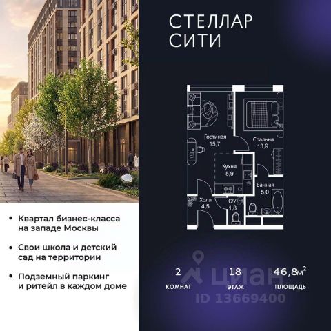Продается квартира от надежного застройщика Tashir Estate в квартале бизнес-класса Stellar City в ЗАО Москвы. Площадь квартиры составляет: 39.5 кв. м, потолки: 3.1 м Квартира находится на 17 этаже, 4 корпуса жилого квартала Stellar City — микрогорода будущего на орбите Москвы. Stellar City — квартал в ЗАО Москвы вблизи инновационного центра Сколково. В окружении — 11 парков и природных зон, в том числе Долина реки Сетунь, Мещерский лес и парк развлечений The Rink. Город в городе Чтобы дом и инфраструктура вокруг отвечала динамичному лайфстайлу жителя мегаполиса, в основу проекта легла концепция город в городе, которая позволяет решать все бытовые вопросы in-home. В квартале будут возведены школа и детский сад, воркаут-зоны, променад, вело и беговые дорожки, детские площадки для каждого корпуса, а также коммерция на первых этажах для ежедневных покупок. Все необходимое — на расстоянии нескольких шагов. Изящные и лаконичные лобби Авторский дизайн, натуральные материалы в отделке и безупречный интерьер вне времени. Лобби и холлы в проекте бизнес-класса Stellar City ничем не отличаются от входных групп в премиум-сегменте благодаря качественным европейским материалам в отделке, стильному дизайну, консьерж-сервису и уютной зоне ожидания с журнальными столиками и мягкой мебелью. Комфорт и безопасность Закрытая территория, охрана, система СКУД, специально разработанное мобильное приложение дома для резидентов и подземный паркинг с круглосуточным наблюдением и доступом с помощью автоматического считывания номера авто.