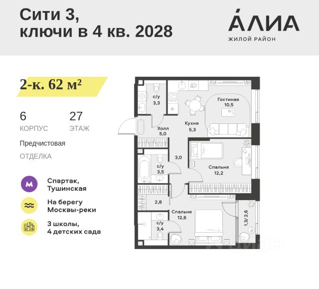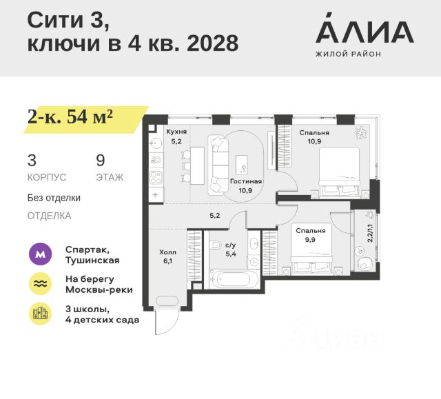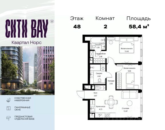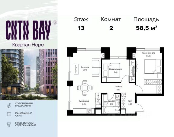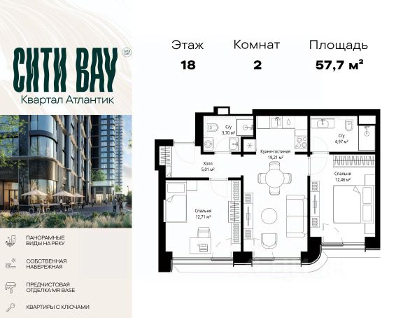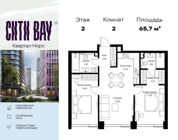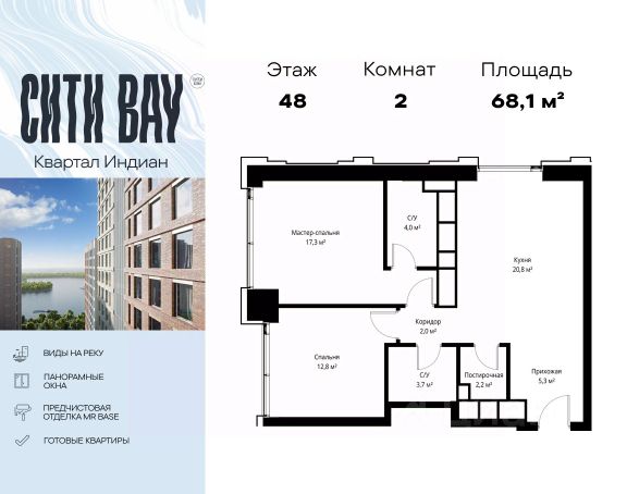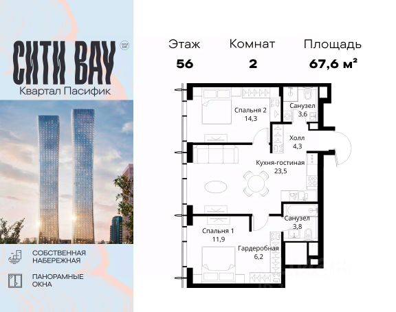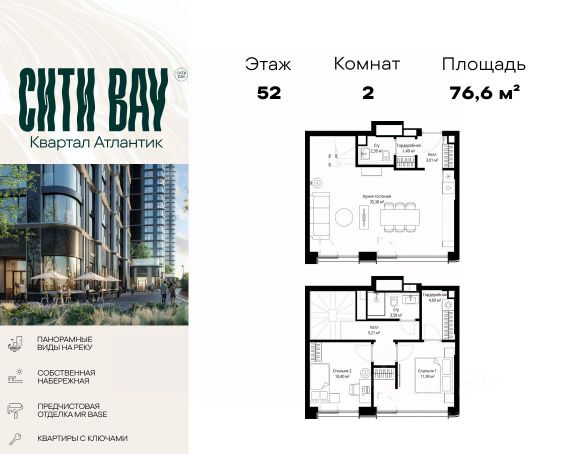Продаётся 2-комнатная квартира общей площадью 78.66 м² с предчистовой отделкой в ЖК Сити Бэй, квартале Клиф, на 2-м этаже 15 этажного дома.