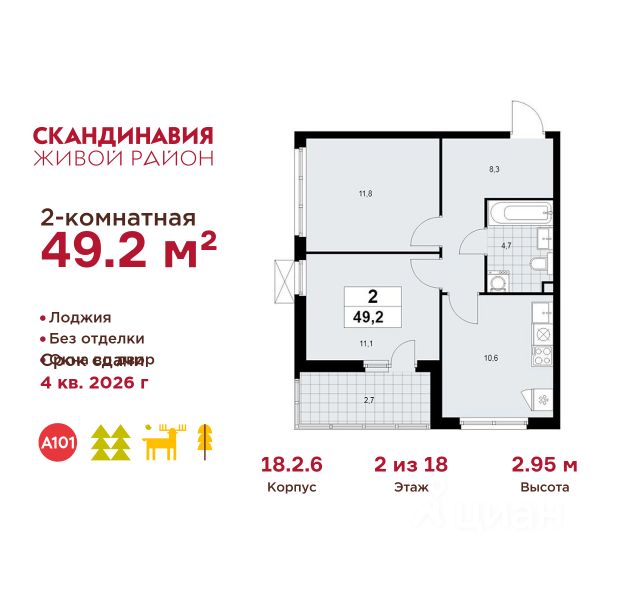 Продается двухкомнатная квартира 666 в новостройке Жилой район "Скандинавия" по адресу Москва, ТиНАО, Новомосковский АО, Сосенское С/П, Коммунарка пос., жилой комплекс Скандинавия, 18.2.6, район Коммунарка, Новомосковский административный округ, Москва. Общая площадь квартиры - 49.20 кв. м., этаж 2 из 18, секция 10. Тип проекта, по которому построен дом - монолит, компания-застройщик - ООО "А101". Стоимость квартиры - 18622200 Р. Срок сдачи - 4 квартал 2026. ПРЕДЛОЖЕНИЯ ОТ ЗАСТРОЙЩИКА В ФЕВРАЛЕ 2026: Скидки до 10% на все квартиры. Только в офисах продаж до 28 февраля. Ипотека от 13,9 % для всех! На весь срок. "Семейная ипотека" вернулась. Ставка от 3,5 % на весь срок! Без удорожания! Выгодное ипотечное комбо: Ипотека от 2200 р./мес. и от 6 % после рождения ребёнка! Ипотека для всех "Держи пять!" - ставка 5 % на 2 года! *более подробную информацию по скидкам и акциям уточняйте в отделе продаж ЖК "Скандинавия" на границе Бутовского лесопарка (1610 га) - это баланс качественного жилья и сервисов, зелёных пространств для активного и созерцательного отдыха. Выразительная архитектура и цветовая гамма монолитных корпусов комфорт- и бизнес-класса (8-17 этажей) созвучны скандинавским мотивам, органично интегрированы в великолепный природный контекст. Огороженные дворы свободны от машин, в них продуманы места для отдыха и работы на свежем воздухе, озеленение, детские и спортивные площадки. Для прогулок, встреч и районных праздников - площадь Туве Янссон с "сухим" фонтаном, вековыми дубами и единственным в мире памятником писательнице; пешеходный променад 2 км; 3 крупных природных ручья; более 15 км велосипедных и прогулочных дорожек с арт-объектами. Инфраструктура района включает современные школы и детские сады, центр впечатлений, фитнес-клубы, развивающие и творческие центры, магазины, кафе, салоны красоты. На подземных этажах - паркинги и кладовые. Преимущества "Скандинавии": - ст. метро "Потапово" - 100 м от ближайших домов (открыта!) - удобные выезды на трассу Солнцево - Бутово - Варшавское шоссе и ул. Бачуринская - свои школы и детские сады - инфраструктура на первых этажах и рядом с домом - лесопарк, природные водоёмы, прогулочные маршруты