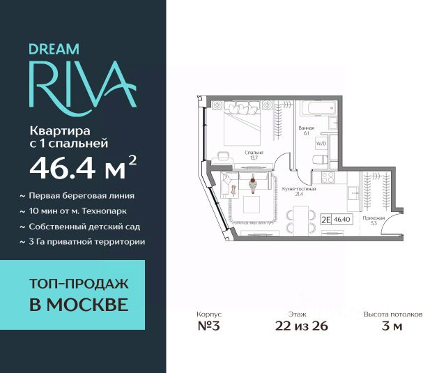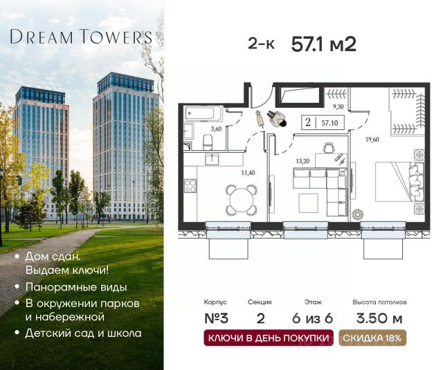 Рассрочка 0% от застройщика. Ключи в день покупки. ЖК Dream Towers проект премиум-класса в окружении парков и набережной, с полностью готовой инфраструктурой для комфортной жизни и отдыха. Продаётся 2-квартира на 17 этаже 24-этажного дома (2 корпус). Общая площадь: 58.1 кв.м. Высота потолков от 3.15 м. Город-курорт на 100 Га в шаге от вашего дома: - пляжный комлекс Dream Beach Club; - парк аттракционов Остров Мечты; - 44 Га ландшафтных парков; - пешеходная набережная; - яхт-клуб; - Южный речной вокзал; - вейк-парк и многое другое. В Dream Towers предусмотрено все для комфортной жизни с семьей: - дизайнерские лобби с общественной гостиной, колясочной и лапомойками; - охраняемый благоустроенной двор только для жителей; - собственный десткий сад и школа прямо во дворе; - красивая архитектура зданий в стиле Ар-деко; - облицовка фасадов из натурального камня с архитектурной подсветкой; - широкоформатное остекление окон в пол для лучших видовых характеристик на парки и пойму Москвы-реки; - подземный паркинг; - клубный формат проживания; - эргономичные планировки от 40 до 162 м2; - высокие потолки от 3,15 до 4,1 м; - квартиры с террасами; - вся необходимая инфраструктура на первых этажах домов, а также в торговой части тематического парка "Остров Мечты" (рестораны, кафе, супермаркет, магазины, салон красоты, йога-студия и многое другое). Центр рядом: 15 минут до Садового кольца на авто, 20 минут до Сити или Кремля. В 5 минутах прогулочным шагом — станция метро "Технопарк". Продается 2-комнатная квартира от застройщика в районе Нагатинский затон в Москве.