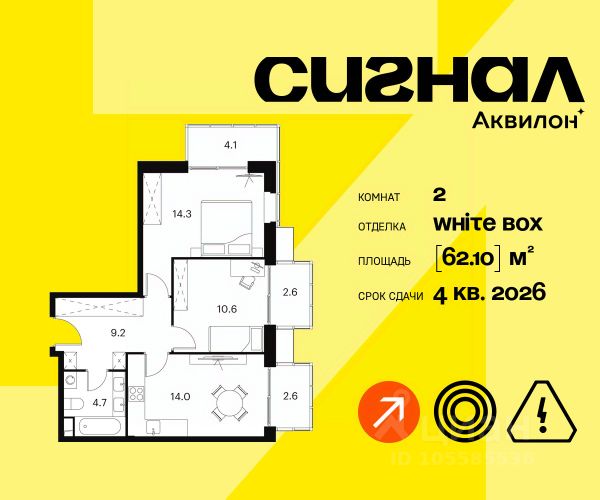 Продажа от застройщика. Продаются просторные 2-комнатные апартаменты на 5 этаже 23-этажного современного апарт-комплекса Сигнал. Срок сдачи: 4 кв. 2026 г. Отделка: Апартаменты передаются в предчистовой отделке white box. Возможен заказ чистовой отделки. Мы выполним все инженерные и черновые отделочные работы, оставив вам самое приятное - создание индивидуального интерьера и неповторимого уюта. А если отпраздновать новоселье хочется как можно скорее, вы сможете заказать чистовую отделку в одном из двух цветовых вариантов: Beigestone или Greystone. Вам останется только завезти мебель и начать наслаждаться жизнью в Сигнал. Расположение: ЖК Сигнал расположен на перекрестке столичных маршрутов. По Сигнальному проезду легко выехать на Алтуфьевское шоссе, СВХ и проспект Мира. Транспортная доступность: - 3 минуты пешком до станции Владыкино - 15 минут на автомобиле до ТТК - Ботанический сад в 10 минутах ходьбы Внутренняя инфраструктура Сигнал: - Фитнес-центр на первом этаже - Игровая площадка и приватном дворе - Коворкинг и уединенные зоны для работы - Торговая галерея Преимущества: - SoundStop - Система защиты от шума, дополнительная шумоизоляция - Система умного дома InHome 3.0 - управление домом нажатием нескольких кнопок - Система Termo-S, позволяющая сэкономить на оплате теплоснабжения - Фитнес-зал позовлит поддерживать себя в форме - Лаунж-зоны, где можно расслабиться - Лобби-бар с большим выбором напитков и закусок - Гостиничный сервис и консьерж reception 24/7 для решения бытовых задач - Апартаменты обслуживает профессиональная управляющая компания - Арт-объекты во дворах для стильного контента Сигнал - это дом, - чья молодость духа и бодрый настрой заряжают всех, независимо от возраста - который задает абициозную планку с самого начала карьеры - где живут интересные события и встречаются хорошие люди Продам 2-комнатную квартиру от застройщика в районе Отрадное в Москве.