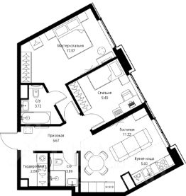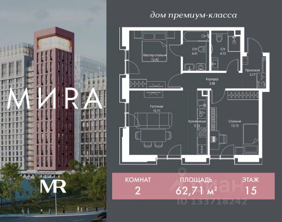 Продаётся 2-комнатная квартира общей площадью 56.56 м² без отделки в доме премиум-класса МИRА на 12-м этаже 23 этажного дома. Квартира расположена в корпусе 2.