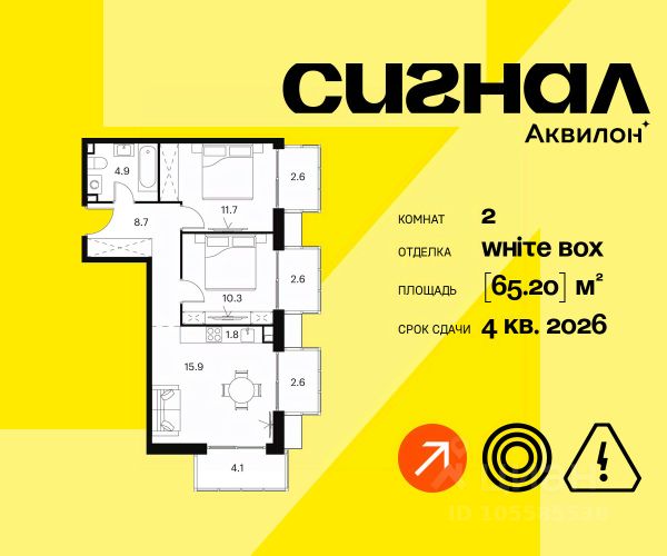 Продаётся 2-комн. квартира площадью 62,6 кв.м на 2 этаже 33 этажного дома (Корпус 2.1.1, Секция 1) проекта ПИК Сигнальный 16. Светлый просторный подъезд на уровне земли, функциональная планировка, большие окна, c отделкой.