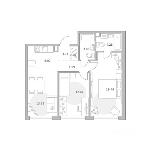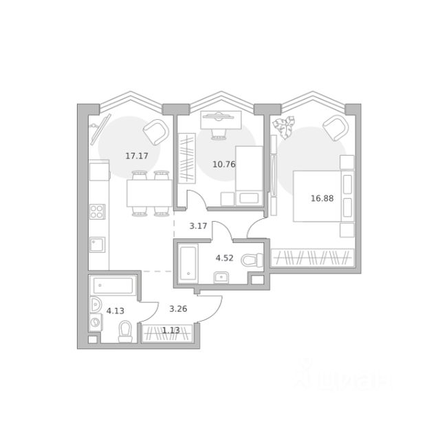 Продаётся 2-комнатная квартира 1755, площадью 61,98 м², на 13 этаже в ЖК "Мнёвники от Гранель" корпус 1. Стоимость — от 32077355 руб. Квартира без отделки, планировка односторонняя, окна во двор.