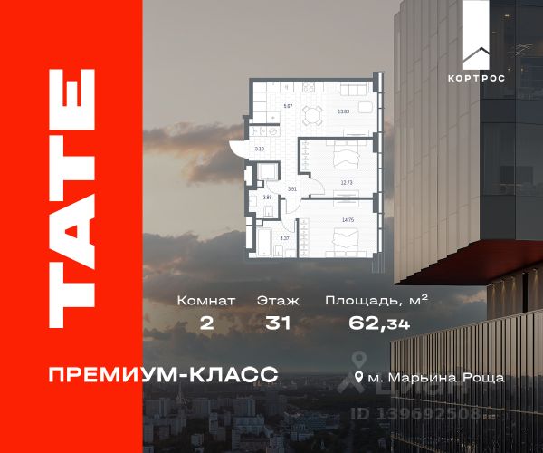 Успейте купить со скидкой 14%! Продается 2-к квартира общей площадью 59.84 м2 с предчистовой отделкой в ЖК премиум-класса ТАТЕ на 22-м этаже 49-этажной башни А. ТАТЕ — жилой комплекс премиум-класса в историческом районе Марьина Роща на границе СЗАО и ЦАО. Две минималистские башни (41-49 этажей) с панорамными видами на Москву, Инфраструктура: светлые лобби с потолками 6 м, арт-лестница на террасу. Спа, фитнес с бассейном, детские/спортивные площадки. Трехуровневое благоустройство от WOW HOUSE. Доступ в жилой комплекс осуществляется по биометрическому контролю. Преимущества: - Авторский минимализм от ГК "КОРТРОС" (топ-10 RAEX) - Панорамные окна, потолки 3,02-4,5 м - Предчистовая отделка - Лаундж на 39 этаже для резидентов с панорамными видами на Останкино, ВДНХ - 6 скоростных лифтов (45 сек на этаж) - Безбарьерная среда, арт-пространства - Спа/фитнес, бассейн, паркинг с сервисами - Закрытая территория с видеонаблюдением и консьерж-сервисом 24/7 - Подземный паркинг на 545 машиномест с зарядками для электромобилей Транспорт: - 5 мин пешком до МЦД-2 - 5 мин до метро "Марьина Роща" - 15 мин до центра Москвы на автомобиле - 10 мин до ТТК - 20 мин до Москва-Сити