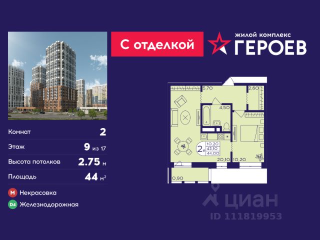 Продаётся 2-комнатная квартира 44 кв. м. в жилом комплексе "Героев" в Балашихе, Железнодорожный. Квартира расположена на 9 этаже 408 корпуса. Все квартиры представлены с чистовой отделкой. Вам не нужно тратить время и дополнительные финансы на ремонт или жить в шуме строительных работ - достаточно перевести свои вещи, расставить мебель и всё готово! Жилой квартал "Героев" - это уютный проект для семей с детьми. Всего 40 минут до центра Москвы. В квартале созданы все условия для досуга всех возрастов: игровые и спортивные площадки, места для отдыха и прогулок, магазины, кафе и пункты выдачи. За 15 минут можно дойти от дома до Ольгинского лесопарка - популярного места для прогулок и отдыха на свежем воздухе. Здесь приятно гулять всей семьёй, заниматься спортом или устроить пикник в выходной день. Преимущества: Квартира с готовой отделкой. Пространство полностью подготовлено для жизни: не нужно тратить время и деньги на ремонт или ждать его окончания. После получения ключей достаточно расставить мебель - и можно сразу заезжать и жить. Продуманные и светлые планировки. Просторные кухни-гостиные создают комфортное пространство для отдыха и встреч с близкими. В квартирах предусмотрены удобные гардеробные, благодаря чему легко поддерживать порядок и не перегружать комнаты шкафами. Увеличенное остекление. Большие окна наполняют квартиру естественным светом в течение всего дня, создавая ощущение простора и уюта, а также визуально расширяя пространство и делая интерьер более воздушным. Пешая доступность до станции Железнодорожная (МЦД-4) - дорога займёт не более 30 минут до центра Москвы: станции метро "Курская", "Площадь Ильича" или ТПУ Нижегородская.