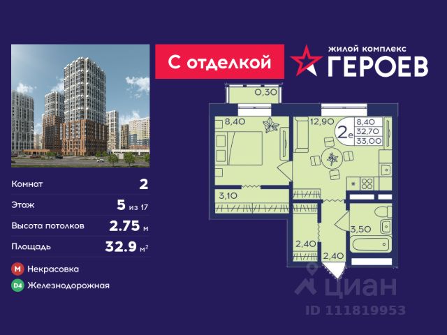 Продаётся 2-комнатная квартира 32.9 кв. м. в жилом комплексе "Героев" в Балашихе, Железнодорожный. Квартира расположена на 5 этаже 407 корпуса. Все квартиры представлены с чистовой отделкой. Вам не нужно тратить время и дополнительные финансы на ремонт или жить в шуме строительных работ - достаточно перевести свои вещи, расставить мебель и всё готово! Жилой квартал "Героев" - это уютный проект для семей с детьми. Всего 40 минут до центра Москвы. В квартале созданы все условия для досуга всех возрастов: игровые и спортивные площадки, места для отдыха и прогулок, магазины, кафе и пункты выдачи. За 15 минут можно дойти от дома до Ольгинского лесопарка - популярного места для прогулок и отдыха на свежем воздухе. Здесь приятно гулять всей семьёй, заниматься спортом или устроить пикник в выходной день. Преимущества: Квартира с готовой отделкой. Пространство полностью подготовлено для жизни: не нужно тратить время и деньги на ремонт или ждать его окончания. После получения ключей достаточно расставить мебель - и можно сразу заезжать и жить. Продуманные и светлые планировки. Просторные кухни-гостиные создают комфортное пространство для отдыха и встреч с близкими. В квартирах предусмотрены удобные гардеробные, благодаря чему легко поддерживать порядок и не перегружать комнаты шкафами. Увеличенное остекление. Большие окна наполняют квартиру естественным светом в течение всего дня, создавая ощущение простора и уюта, а также визуально расширяя пространство и делая интерьер более воздушным. Пешая доступность до станции Железнодорожная (МЦД-4) - дорога займёт не более 30 минут до центра Москвы: станции метро "Курская", "Площадь Ильича" или ТПУ Нижегородская.