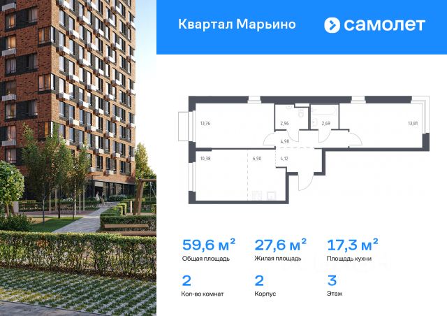 Предлагается 2-комнатная квартира комфорт-класса 59,64 кв.м в корпусе 4 на 12 этаже, в ЖК "Квартал Марьино" Квартира с чистовой отделкой. Доступность дополнительных опций уточняйте у застройщика. Приобрести квартиру возможно по специальным акциям от застройщика, с текущими условиями акций можно ознакомиться в блоке "Акций". Цена динамическая и может отличаться, уточняйте актуальность у застройщика. "Квартал Марьино" — проект в Новой Москве, в 18 км от МКАД, вблизи Валуевского лесопарка. Здесь будет все, чтобы получать удовольствие от жизни: приватные дворы-парки без машин, инфраструктура в шаговой доступности и общественные пространства для разнообразных занятий на свежем воздухе. До станции метро "Филатов луг" — 15 минут на машине по Филимонковскому шоссе. Живописные места для отдыха на природе — на расстоянии 2-5 км от дома. На территории будут построены 6 детских садов, 4 школы, поликлиника и спортивный комплекс, а также кафе, магазины и салоны красоты на первых этажах жилых домов. В закрытых дворах-парках предусмотрены игровые площадки, лужайки для пикников и йоги. Пространства для спокойного отдыха будут огорожены живыми изгородями. Дизайн-код проекта — "Полевые цветы". Он прослеживается в каждой детали — от натуральных оттенков фасадов до элементов благоустройства в эко-стиле.