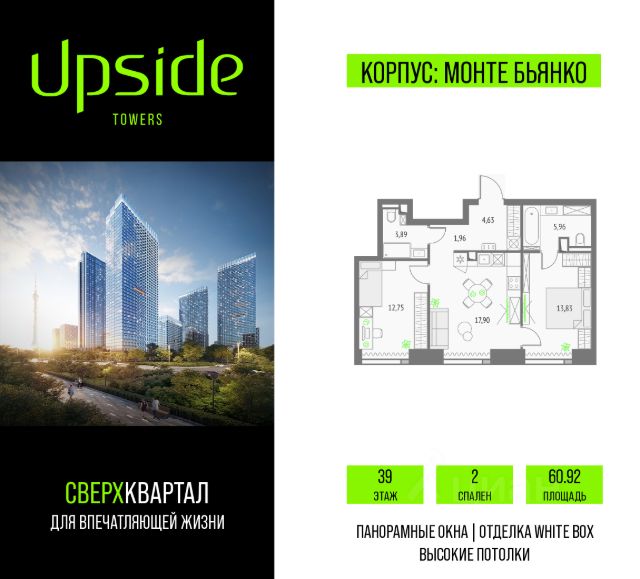 Продаётся 2-комнатная квартира площадью 58.13 кв.м на 3 этаже 46 этажного корпуса Монте Бьянко в квартале небоскребов "Upside Towers". В квартире отделка White-box, c видом на Звездный бульвар, Ольгинский храм, корпус Эверест. Номер квартиры Г0306. Upside Towers - технологичный квартал строится в динамично развивающемся Бутырском районе, в 3 мин. от метро, в 5 мин. от ТТК. На территории 7 га возводится 5 высотных башен от 19 до 58 этажей, названных в честь главных вершин земли. Квартиры с панорамными окнами в пол, высокими потолками и современными инженерными решениями. Благоустроенная зеленая территория включает: приватные дворы, природный комплекс, прогулочный бульвар, ландшафтный парк 2,5 га с сенсорным садом и многофункциональными игровыми и спортивными площадками. В корпусе откроется смотровая площадка для резидентов с панорамными видами на город, парки, Останкинскую башню, ВДНХ, Ботанический сад и Москву-Сити. На первых этажах корпуса Монте Бьянко разместятся: фитнес студия, салон красоты, центр превентивной медицины, образовательные классы, книжный магазин, аптека, фермерская лавка, а также келлеры для хранения сезонных вещей. В приватном закрытом дворе разместятся разнообразные площадки для прогулок, игр и отдыха. Визитной карточкой двора станет уникальная биометрическая игровая пещера со сказочными тоннелями, горками и космическими "мягкими" камнями с неизведанных планет. Планету Земля дети смогут исследовать в павильоне круглый год: объемная крыша укроет от солнца и дождя. Игровая пещера будет реализована в стиле "эмоциональная архитектура". Большое внимание в проекте уделяется созданию социальной инфраструктуры. В стилобатной части, между корпусами "Атлас" и "Олимп" разместится уникальное пространство закрытый клуб для жителей квартала Upside Club площадью 2 000 кв. м. Здесь разместятся: каминный зал с роялем, многофункциональная детская зона c двухуровневым игровым оборудованием для малышей и дошкольников, плей-рум для подростков, домашний кинотеатр, коворкинг, переговорные и лектории. На 47 этаже башни "Атлас" откроется SKY SPA Relax с расслабляющей атмосферой, джакузи, сауной, залами для релаксации и йоги. Собственники квартир смогут в любое удобное для них время забронировать посещение спа-зоны через смарт-приложение. На крыше стилобата разместится всесезонная BBQ патио-зона с верандой и закрытыми помещениями для приготовления и отдыха. Покупая квартиру даже самого минимального размера в Upside Towers, вы получаете в пользование 2 000 м² бесплатных общественных пространств. В рамках проекта строится государственная школа и детский сад, разместится более 15 000 кв.м. коммерческой инфраструктуры. Насыщенная социальная инфраструктура формирует множество сценариев для жизни на территории квартала. В Upside Towers применяются лучшие технологии и практики, чтобы обеспечить высшее качество жизни: Воздух, не уступающий по качеству горному, обеспечит приточно-вытяжная вентиляция. Пятиступенчатая очистка воды с сохранением п