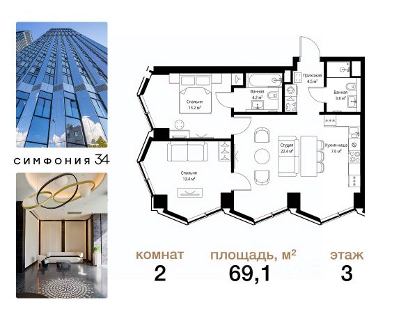 Дом сдан. Ключи в день покупки! В продаже 2-комнатная квартира площадью 63.20 м² с предчистовой отделкой на 25 этаже 54 этажного дома в корпусе Графит. ЖК Симфония 34 - концептуально новый жилой комплекс премиум-класса с подземной парковкой, состоит из четырех башен высотой 36 - 54 этажа. Квартиры сдаются с базовой (предчистовой) отделкой MR BASE или дизайнерской чистовой отделкой MR READY. Высота потолков 3 - 6 метров, окна высотой до 2,6 м. Более 100 кладовых в подземной части ЖК и более 500 на этажах. Безопасность - Система контроля входа на территорию комплекса, биометрия - Система автоматического водяного пожаротушения и противопожарного водопровода, система пожарной вентиляции - Доступ на парковку при помощи системы распознавания автомобильных номеров, карточка для контроля доступа резидентов - Система видеонаблюдения - Круглосуточная связь через приложение, телефон, голосовые сообщения с охраной, консьержем, call-центр. Расположение Пешком - 6 минут до метро "Дмитровская" - 15 минут до Тимирязевского парка На машине - 5 минут до Савеловского вокзала и Аэроэкспресса в Шереметьево - 10 минут до Москва-Сити и Садового кольца Благоустройство - 70% территории отведены под зеленые насаждения и ландшафтный дизайн - Приватный Японский сад - Детские площадки с зонированием по возрасту - Clubhouse для резидентов - Wellness & SPA - Зона для пикника, зона с гамаками - Центральное лобби, ресторан, коммерческие помещения - Дополнительный вход/выход на территорию комплекса Окружение - В 10 минутах от Симфония 34 находится дизайн-завод Flacon, где регулярно проходят культурно-образовательные и развлекательные мероприятия - Тимирязевский парк расположен в 850 м. Площадь парка 232 га - Рядом расположен парк "Дубки", площадью 16,5 га. - В 15 минутах расположен Хлебозавод 9. Здесь находятся шоурумы брендов, кафе разных кухонь мира, образовательные проекты и площадки для мероприятий Компания MR предлагает своим клиентам специальные условия приобретения квартир в рамках программ ипотечного кредитования от банков-партнеров.