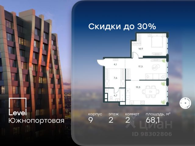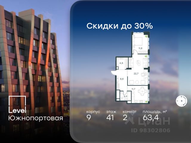 Цена указана с учётом скидки при 100%-й оплате, несубсидированной ипотеке, рассрочке (кроме программы "Рассрочка 0%"). В северной части района Печатники продается 2-комнатная квартира площадью 58.60 кв.м с отделкой white box. Квартира расположена на 16 этаже 49-этажного корпуса 9 в жилом комплексе комфорт-класса Level Южнопортовая (компания Level Group/Левел групп). Отличная транспортная доступность: - 10 мин. пешком до станции метро "Кожуховская"; - 20 мин. пешком до станции МЦК "Дубровка"; - 3 мин. на авто до ТТК; - 13 мин. на авто до Садового кольца; - 15 мин. на авто до Бульварного кольца. Продуманный архитектурный проект: - авторская архитектура от бюро СПИЧ; - уникальные виды на реку, парки и достопримечательности города; - высота потолков в квартирах до 6 м; - окна высотой до 1,87 м с высоким коэффициентом сопротивления теплоотдаче. Расположение: Level Южнопортовая строится в северной части района Печатники - самой приближенной к центру. Здесь будет сформирован новый район "Южный порт", где построят крупный жилой и общественно-деловой центр, аналогичный Москва-Сити. В течение 10-12 лет в этом месте появятся не только жилые дома, но и развитая инфраструктура для жизни и работы. А еще совсем рядом находится набережная Москвы-реки, где планируется построить причалы для речных трамвайчиков и канатную дорогу. Уже сейчас вокруг жилого комплекса работают десятки магазинов и торговых центров, рядом расположено 6 парков, среди которых музей-заповедник "Коломенское". В 10 минутах пешком - 2 муниципальных и 2 частных детских сада, 7 общеобразовательных школ. Внутренняя инфраструктура: Для отдыха жителей в каждом корпусе предусмотрено лобби, оснащенное местами для отдыха, гостевыми санузлами и лапомойками, а в отдельных корпусах - камином. За счёт больших окон и высоких потолков пространства будут наполнены воздухом и светом. На первых этажах жилого комплекса откроются магазины, салоны красоты, фитнес-центр. Для детей строятся собственные детский сад и школа. Благоустройство: Внутренний двор комплекса разработан совместно с бюро GAFA. Основная идея - создать аналог Центрального парка в Нью-Йорке, гармонично сочетая высотные здания и большое изолированное парковое пространство. Вся площадь двора-парка будет огорожена и составит более 2 га, из которых 45% - озеленение. Одним из самых важных ландшафтных элементов здесь станет небольшая речка, наполняющаяся во время дождя. Вокруг неё появится сеть из островов, внутри которых расположатся тематические зоны спорта и отдыха. Технологии и инженерия: - автоматическая передача в управляющую компанию показаний квартирных счётчиков; - телефонная связь, телевидение и интернет на базе оптической мультисервисной сети; - гостевой Wi-Fi в лобби и на территории двора; - единый ключ доступа для входа на территорию комплекса.
