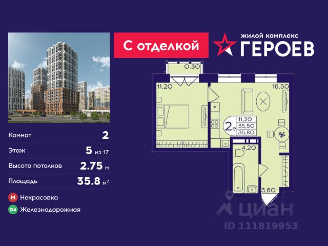 Продаётся 2-комнатная квартира 37.1 кв. м. в жилом комплексе "Героев" в Балашихе, Железнодорожный. Квартира расположена на 8 этаже 611 корпуса. Все квартиры представлены с чистовой отделкой. Вам не нужно тратить время и дополнительные финансы на ремонт или жить в шуме строительных работ - достаточно перевести свои вещи, расставить мебель и всё готово! Жилой квартал "Героев" - это уютный проект для семей с детьми. Всего 40 минут до центра Москвы. В квартале созданы все условия для досуга всех возрастов: игровые и спортивные площадки, места для отдыха и прогулок, магазины, кафе и пункты выдачи. За 15 минут можно дойти от дома до Ольгинского лесопарка - популярного места для прогулок и отдыха на свежем воздухе. Здесь приятно гулять всей семьёй, заниматься спортом или устроить пикник в выходной день. Преимущества: Квартира с готовой отделкой. Пространство полностью подготовлено для жизни: не нужно тратить время и деньги на ремонт или ждать его окончания. После получения ключей достаточно расставить мебель - и можно сразу заезжать и жить. Продуманные и светлые планировки. Просторные кухни-гостиные создают комфортное пространство для отдыха и встреч с близкими. В квартирах предусмотрены удобные гардеробные, благодаря чему легко поддерживать порядок и не перегружать комнаты шкафами. Увеличенное остекление. Большие окна наполняют квартиру естественным светом в течение всего дня, создавая ощущение простора и уюта, а также визуально расширяя пространство и делая интерьер более воздушным. Пешая доступность до станции Железнодорожная (МЦД-4) - дорога займёт не более 30 минут до центра Москвы: станции метро "Курская", "Площадь Ильича" или ТПУ Нижегородская.