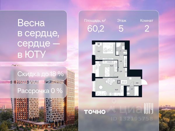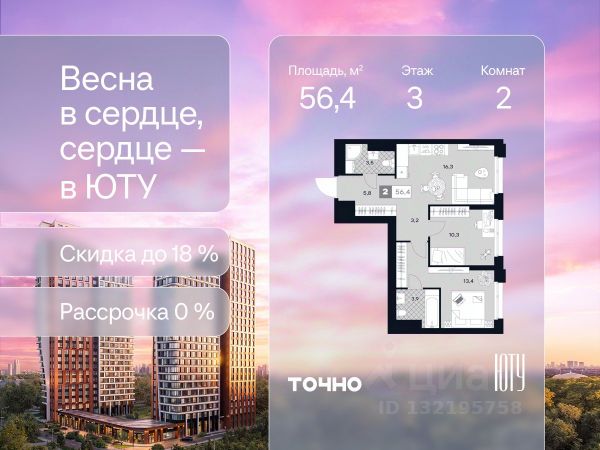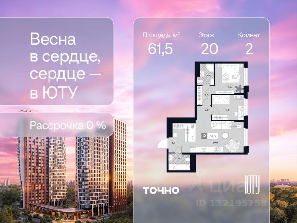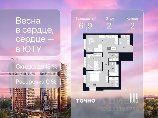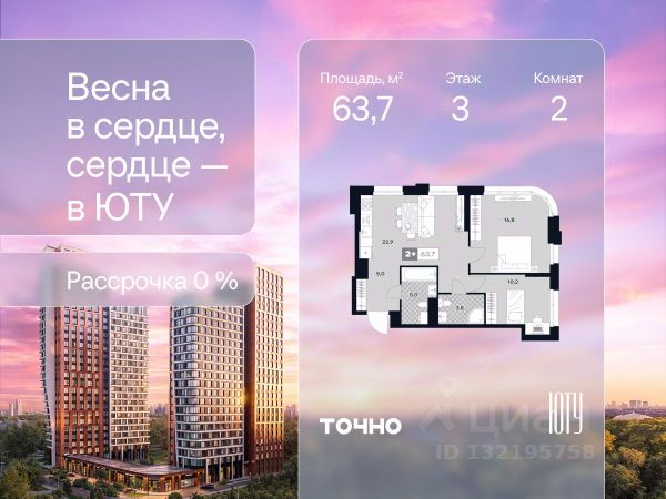 Скидка до 18% в апреле на выделенный пул лотов! ЮТУ — камерный проект бизнес-класса с исключительной архитектурой, видовыми квартирами и подходом к большой благоустроенной набережной канала имени Москвы. Проект создает идеальный баланс жизни в городе. Это приватный оазис, где в любой момент можно сменить обстановку и выбрать любой из тысячи маршрутов к активному отдыху и ярким впечатлениям. Удачное месторасположение: • Первая линия в прибрежной части Химкинского водохранилища • Исключительно тихий и зелёный район Южное Тушино • За 2 минуты можно спуститься к воде, за 10 минут найти зеленые парки и готовую инфраструктуру, за 30 минут доехать до Кремля Концепция проекта: • Две футуристичные башни, соединенные торговой галереей от бюро ATRIUM • 60 неповторяющихся планировок: квартиры с угловым панорамным остеклением, мастер-спальнями и гостиными до 39м², а также просторные квартиры площадью до 128,6 м² Чувство эксклюзивности: • Своя приватная жилая экосистема только для резидентов домов • Лаунж-терраса на крыше • В проекте предусмотрен закрытый двор-парк. Прогрессивные технологии: • 3-х уровневая система безопасности (Face ID, BLE-метки, видеонаблюдение) • Умный паркинг с распознаванием номеров Проект федерального девелопера ТОЧНО, который входит в ТОП-5 девелоперов России по объемам строительства.