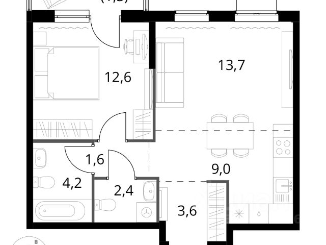 Квартира с кухней-гостиной и двумя спальнями в квартале "Метроном". Особенности планировки: балкон, предчистовая отделка. квартиры в нашей базе: КВМ-КВМ01-1-1.14.2.