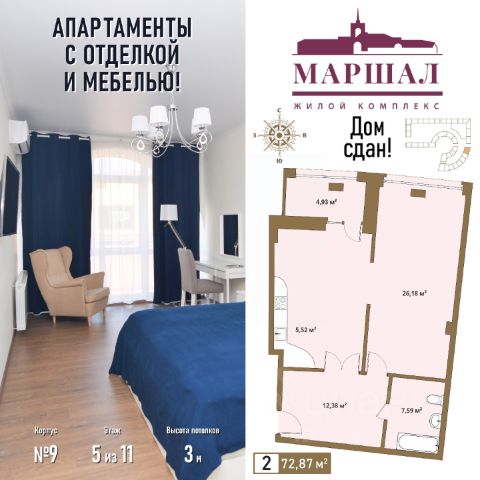 Продаётся 2-комнатная квартира в сданном доме (Маршала Рыбалко, 2К4), срок сдачи: IV-кв. 2011, общей площадью 47.23 кв.м., на 5 этаже. Готовая квартира в элитном МФК "Маршал" с премиальной отделкой "под ключ" (экологичное напольное покрытие - инженерная доска Greenline и керамогранит, высококачественные системы кондиционирования и сантехническое оборудование), выполненной европейскими специалистами по эксклюзивным дизайн-проектам, подчеркнет высокий статус владельца. В квартире выполнен новый ремонт и НИКТО НЕ ЖИЛ с момента ввода в эксплуатацию. Квартиры 4-го корп. продаются с полной отделкой, что обеспечивает комфорт проживания в доме сразу после получения ключей, т.к. исключает длительный период ремонта квартир - у вас и соседей, а также сохранит презентабельные входные группы в идеальном состоянии. Из панорамных окон премиального бренда Schuco открываются завораживающие виды на столицу или уютный двор-патио с красивым ландшафтным дизайном и фонтаном, играющим огнями разноцветной подсветки в вечернее время. Роскошные интерьеры лобби: натуральный испанский мрамор, оникс, итальянская люстра ручной работы, кованая мебель. Лифты премиум-класса ThyssenKrupp. Консьерж-служба. Видеонаблюдение. Элегантные межквартирные холлы. Двери квартир со вставками из массива дуба выполнены в едином стиле. На этажах мусорокамеры закрытого типа. Элитные домофоны CAME BPT с абонентским IP-устройством hands-free с сенсорным 7 дисплеем, Wi-Fi модулем, функцией записи вызовов и автоответчика, интеграцией с IP-камерами видеонаблюдения и мобильным приложением, которое переадресует вызов с домофона на ваш смартфон - вы сможете принять его, находясь вне дома, и открыть дверь в подъезд. Из квартиры можно в любой момент связаться с консьержем по видеодомофону. МФК "Маршал" - самодостаточный город в городе на большой - 6,3 га - охраняемой территории. Большую часть занимают зеленые зоны, скверы с аллеями и фонтаном, детские городки, спортивные площадки для подвижных игр, воркаута и теннисный корт с мягким покрытием. У комплекса уникальная транспортная доступность: рядом ТПУ Панфиловская, Северо-Западная хорда, соединяющая несколько районов столицы, в 5 мин. ходьбы - ст. м. Октябрьское Поле. В нескольких мин. езды - Ленинградский пр-т, по которому можно быстро доехать до ТТК или центра Москвы, и Ленинградское ш., ведущее к аэропорту Шереметьево. Богатая собственная инфраструктура МФК "Маршал": детсады (в т. ч. английский), творческие и спортивные студии, студия раннего плавания, здание фитнес-центра с бассейном, минимаркет AB Daily, подземный паркинг на 1200 м/м, химчистка, салоны красоты, кафе, рестораны, медцентр, БЦ класса B+, где можно арендовать/купить офис и работать рядом с домом, и т.д. Комплекс получил награду TREFI Лучший проект бизнес-класса в Москве. Рядом - старинный храм, в 10 мин. ходьбы - Большая Всехсвятская Роща. Отличная внешняя инфраструктура респектабельного района Щукино: детсады, элитные общеобразовательные, музыкальные и спортивные школы, ТЦ