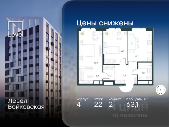Цена указана с учётом скидки при 100%-й оплате, несубсидированной ипотеке, рассрочке (кроме программы "Рассрочка 0%"). Продается 2-комнатная квартира площадью 63.10 кв. м с отделкой. Квартира находится на 22 этаже 26-этажного корпуса 4, в новом жилом комплексе бизнес-класса Левел Войковская, расположенном рядом с живописным заповедником "Покровское-Стрешнево" (застройщик - компания Level Group/Левел групп). Прекрасная транспортная доступность - 7 мин. пешком до станции МЦК "Балтийская"; - 15 мин. пешком до станции метро "Войковская"; - 8 мин. на машине до ТТК; - 15 мин. на машине до центра Москвы; - 20 мин. на машине до Москва-Сити. Продуманный архитектурный проект - стильная архитектура от мастерской Фефелова В. В.; - панорамные виды на парки, Химкинское водохранилище и Останкинскую башню; - лобби с высотой потолков до 6,45 метров; - более 20 видов планировок, включая редкие форматы квартир с террасой и увеличенной высотой потолков до 5,42 метров; - 2 варианта дизайнерской отделки в корпусе 4 как дополнительная опция к предчистовой отделке: стиль Модерн в светлых холодных тонах и стиль Классик в нейтральной бежевой гамме. Квартиры в корпусах 3 и 5 сдаются без отделки. Расположение Жилой комплекс Левел Войковская строится в престижном Северном округе Москвы, где развитая инфраструктура и живописная природа переплетаются в единый ансамбль. Войковский район окружают парки и набережные. В шаговой доступности - парк "Покровское-Стрешнево", не более 15-ти минут на велосипеде занимает путь до Тимирязевского парка и 9-ти минут до парка усадьбы Михалково. Рядом более 60 школ, 75 дошкольных учреждений, 17 государственных и 6 частных вузов, 25 супермаркетов, 4 торговых центра, среди которых ТЦ "Метрополис" и ТЦ "Авиапарк". Внутренняя инфраструктура На территории жилого комплекса предусмотрены коммерческие помещения: кафе, ресторан, пекарня и другие сервисы на первых этажах корпусов. Для жителей будет доступен отапливаемый подземный паркинг на 244 машино-места с доступом с любого этажа на лифте. На территории паркинга будет расположено 125 кладовых помещений для хранения сезонного инвентаря. Лобби и благоустройство Дизайн лобби жилого комплекса Левел Войковская создан совместно с бюро "Бланк Архитектс" (Blank Architects). Теплая цветовая гамма, ресепшен, зоны ожидания, лапомойки и гостевые санузлы - каждая деталь превращает лобби в комфортное продолжение вашего дома. 1,15 га площади в первых двух этапах строительства отведено под приватный внутренний двор, который спроектирован совместно с бюро "Правда". Детские площадки для всех возрастов, спортивные пространства для йоги, уличных тренировок и петанка, уютные зоны для тихого отдыха или работы. Здесь утро начинается с вдохновения, а вечер наполнен приятными моментами. Лифты Комфортное перемещение внутри жилого комплекса обеспечат надёжные лифты с доступом в паркинг с жилых этажей. В каждом корпусе предусмотрено по 3 грузопассажирских лифта. Купить 2-комнатную квартиру с отделкой в районе Войковский в Москве.