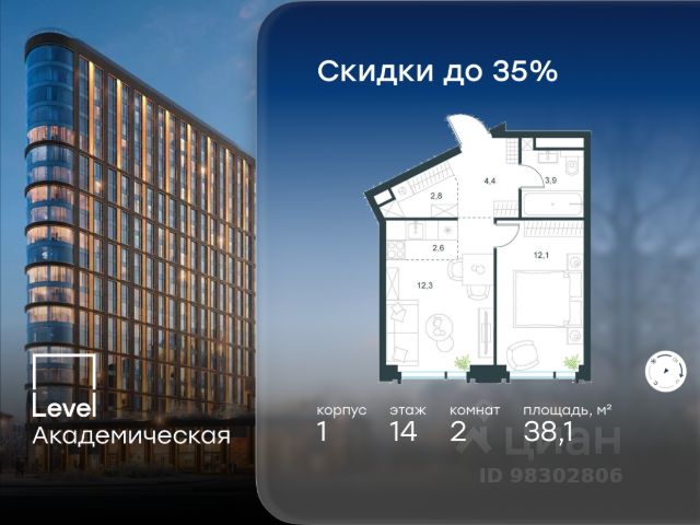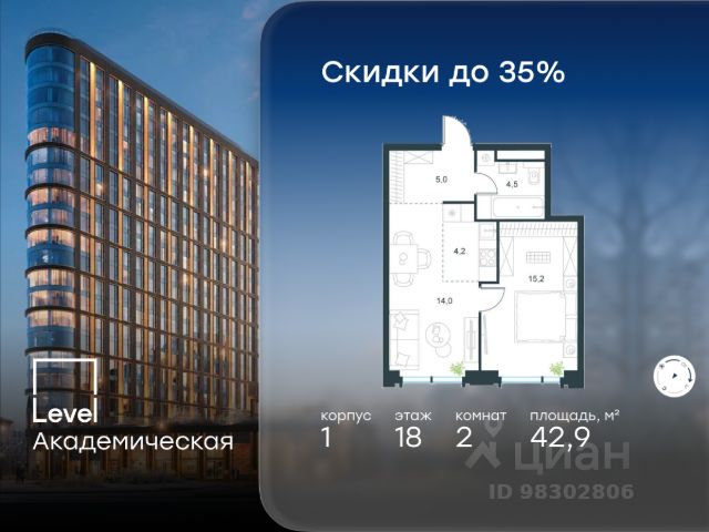 Цена указана с учётом скидки при 100%-й оплате, несубсидированной ипотеке, рассрочке (кроме программы "Рассрочка 0%"). В Академическом районе продаётся 2-комнатная квартира площадью 46.20 кв.м без отделки. Квартира расположена на 18-м этаже 19-этажного жилого комплекса бизнес-класса Level Академическая (компания Level Group). Отличная транспортная доступность: - 1 мин. пешком до станции метро "Академическая"; - 4 мин. на автомобиле до ТТК; - 8 мин. на автомобиле до Садового кольца; - 13 мин. на автомобиле до Кремля. Продуманный архитектурный проект: - современная архитектура от бюро UNK project; - высокие потолки в квартирах до 6,62 м; - окна в пол высотой 2,5-2,68 м с панорамным видом на МГУ, Москва-Сити и другие доминанты Москвы; - квартиры с моллированным остеклением - радиусные окна открывают увеличенный угол обзора; - более 20 вариантов планировочных решений; - уникальные квартиры с собственным патио и возможностью обустройства дровяного камина; - квартиры сдаются без отделки, что открывает свободу для создания интерьера по своему вкусу. Расположение: Камерный проект из 1 корпуса расположен тихом зеленом районе Москвы, в непосредственной близости к центру города. В округе построено 80 детских садов, 50 школ и 30 вузов, 7 из которых входят в топ100 вузов России: МГУ, МГИМО, РАНХиГС, МИСИС, РУДН, РЭУ им. Плеханова и РГУ нефти и газа им. Губкина. Этот район буквально утопает в зелени парков, начиная с уютного Академического в 6 минутах пешком и заканчивая одним из крупнейших в городе парком 50-летия Октября (12 минут на автомобиле). Общая площадь природных объектов в радиусе 2-6 км от дома - 476,5 га. Внутренняя инфраструктура: На территории Level Академическая откроется собственный торговый центр, а для отдыха жителей будут созданы общественные пространства: комфортное лобби с дизайнерской отделкой, окнами в пол и потолками высотой 4,5 м, а также две благоустроенные зоны - территория по периметру здания и пространство на стилобате. Во дворе на стилобате предусмотрены детская и спортивная площадки, коворкинг и лаунж-зона на открытом воздухе. Стилобат украсят скульптуры животных - жирафа, зайца и волка, которые станут ярким акцентом внутреннего двора Level Академическая, подчеркивая близость к музею Дарвина. Процент озеленения территории - 58%. Технологии и безопасность: Жителей Level Академическая не коснется ежегодное отключение горячей воды благодаря собственным центральным водонагревателям. Безопасность гарантирует круглосуточная охрана, безлимитный Wi-Fi, круглосуточное видеонаблюдение. Удобное перемещение внутри комплекса будут обеспечивать 5 лифтов с доступом в паркинг с жилых этажей. 2-комнатная квартира первичка в районе Академический в Москве.