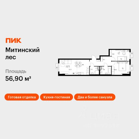 Продаем евротрешку! Общая площадь - 50,6 кв.м. Площадь кухни-гостиной - 17,8 кв.м. Два санузла. 4 этаж. Застройщик ПИК: ЖК "Митинский лес". Полная отделка. Окна во двор. Два взрослых собственника. Дата получения ключей по договору до 15.11.2028 г. Продажа от собственника. Квартира в ипотеке. Никаких других обременений нет. Продаем сами, агентов просьба без покупателей не беспокоить.