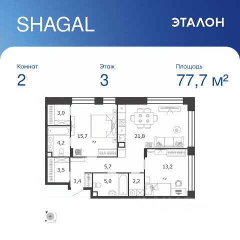Продается 2-к квартира без отделки в ЖК "Shagal". Общая площадь квартиры — 77.7 кв. м, этаж 3 из 13. Тип дома — монолитный. Цена указана при 100% оплате. Квартал Shagal — крупнейший проект комплексного освоения в Москве. В проекте реализуется продуманная система маршрутов. Еда, покупки, услуги, прогулки, спорт, образование, работа и развлечения — все будет находиться рядом с домом: принцип 15-минутной доступности инфраструктуры и сервисов. Разнообразие и продуманность пешеходных маршрутов, а также короткие расстояния между основными точками притяжения мотивируют резидентов Shagal с удовольствием передвигаться по району пешком, не выпадая из ритма большого города. Продуманная транспортная сеть района и безопасный скоростной режим создают комфортные условия для перемещений любым способом: на автобусе, машине, самокате или велосипеде. Не нужно выезжать из района, чтобы получить комфорт и сервис самого высокого современного стандарта: все необходимые услуги, инфраструктура, парки и вторая по протяженности набережная в городе — на расстоянии 15-минутной прогулки от вашего дома. Квартал Shagal станет первым в Москве жилым районом, где будут комплексно реализованы инновационные подходы в проектировании и строительстве зданий. Архитектурная композиция состоит из домов отличающегося типа. Высотные башни-доминанты с видовыми квартирами, дома пониже, растворяющиеся в спокойствии внутренних двориков, малоэтажные камерные таунхаусы и разноэтажные дома с лоджиями на первой береговой линии соединяются в одно эстетичное современное произведение. В результате создаётся насыщенное идентичное пространство, подчёркнутое плавностью природных форм, наполненное светом, воздухом и свободой.