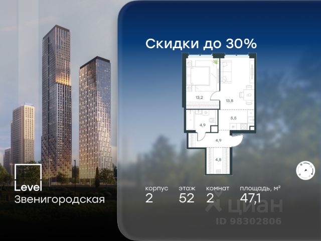 Цена указана с учётом скидки при 100%-й оплате, несубсидированной ипотеке, рассрочке (кроме программы "Рассрочка 0%"). В жилом квартале продаётся 2-комнатная квартира площадью 53.60 кв.м без отделки. Квартира расположена на 12 этаже 64 этажного корпуса 2 в жилом комплексе комфорт класса Level Звенигородская (компания Level Group/Левел групп). Отличная транспортная доступность - 5 мин. пешком до метро "Звенигородская" (откроется к окончанию строительства); - 18 мин. пешком до станции МЦК "Хорошёво" и станции БКЛ "Народное ополчение"; - 4 мин. на авто до ТТК; - 8 мин. на авто до Садового кольца; - 15 мин. на авто до Кремля. Продуманный архитектурный проект - Концепция от студии Станислава Михаловского, в основу которой легло единение природы и города; - Двухкамерные стеклопакеты в окнах, алюминиевый и ПВХ профиль - в квартирах тепло зимой и прохладно летом; - С верхних этажей откроются панорамные виды на город, Москву-реку, "Москва-Сити" и Москворецкий парк; - Лобби со всеми удобствами: окна в пол, высокие потолки до 4,7 м, лаунж-зоны, колясочные, гостевые санузлы и мойки для лап животных; - Централизованные водонагреватели гарантируют круглогодичную подачу горячей воды в каждую квартиру. Благоустройство Концепция благоустройства разработана совместно с бюро UNK landscape. Высота башен приближается к 200 метрам - они словно касаются неба. Небесный простор проецируется на территорию двора с помощью подсветки, визуально увеличивая пространство и отражаясь в авторских элементах архитектуры. На территории площадью 0,45 га расположатся: - "Облако событий" - место встреч и общения; - "Облако спорта" - всё для поддержания себя в форме; - "Облако принятия решений" - пространство для работы на свежем воздухе; - "Облако спокойствия" - для отдыха в тишине природы; - "Облако игр" - площадки для подростков и самых маленьких. Инфраструктура В жилом комплексе откроется 21 коммерческое помещение: продуктовые лавки, кафе, салоны красоты, службы доставки и творческие студии. Этап 1 включает строительство двухуровневого подземного паркинга. Всего здесь расположится 351 машино-место, включая семейные места, и 264 кладовых помещения. В распоряжении жителей развитая инфраструктура района: 15 супермаркетов, 5 спортивных объектов, 9 медучреждений, 7 детских садов, 4 школы, 3 благоустроенных парка - всё в шаговой доступности. Инженерия Комфортное перемещение внутри домов будут обеспечивать надёжные лифты с доступом в паркинг с жилых этажей. В каждом корпусе предусмотрено до шести кабин, включая сервисные лифты. Попасть на территорию комплекса можно только по единому ключу доступа. Видеонаблюдение установлено на входах в подъезды, в лобби, в общих зонах, на въезде в паркинг. Гости смогут связаться с жителями дома через входные видеопанели, а управлять доступом на территорию можно через видеодомофон или приложение на телефоне.