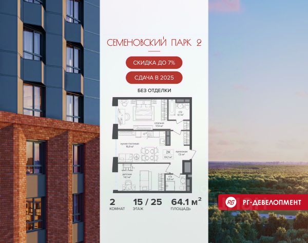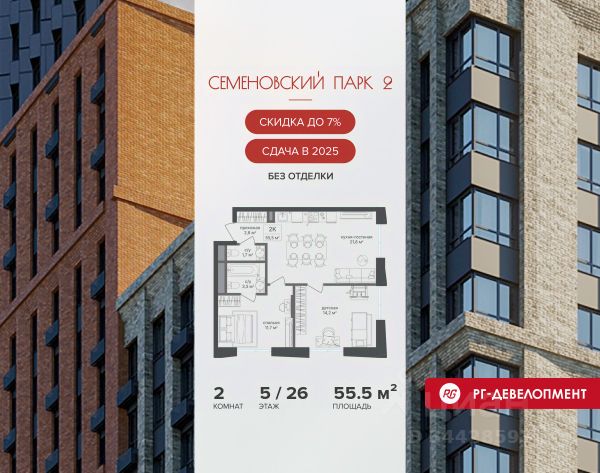 Ипотека для каждого! Полная стоимость кредита от 11,578% до 22,490%. Ставка от 0,11% в АО "Альфа-Банк" фиксируется на 1 год с даты заключения кредитного договора, далее полная стоимость кредита от 25,819% до 28,767% ставка 21,59% до окончания срока кредитования. Первоначальный взнос — от 20% от стоимости квартиры. Срок кредитования — от 3 до 30 лет. Ипотека на весь срок! Полная стоимость кредита от 23,396% до 26,058% со ставкой 14,5%! Первоначальный взнос —от 20,01% от стоимости квартиры. Срок кредитования — от 3 до 30 лет. АО "Банк ДОМ.РФ" универсальная лицензия Банка России 2312 от 19.12.2018. Скидка 7% при покупке квартиры! Цена указана с учетом максимального размера скидки. Продается 2-к квартира 70,2 кв.м. в ЖК "Семеновский парк 2" на 6-м этаже 18 этажного дома. Компания "РГ-Девелопмент" предоставляет скидки на квартиры в жилом комплексе. Акция действительна с 12.09.24 г. до 30.11.25г. включительно. Чтобы воспользоваться предложением, необходимо подписать договор на приобретение недвижимости до 30.11.25г., включительно. Прямая продажа от застройщика! Квартиры без отделки. Срок сдачи корпуса - 4 кв. 2025 г. ЖК "Семеновский парк 2" - это идеальное место для того, чтобы стать вашим домом. Проект расположен в исторической части Москвы вблизи Измайловского лесопарка, в 1 км от ЦАО. 4 станции метро отделяют вас от Красной площади и 15 минут на автомобиле - от Садового кольца. 2-комнатная квартира первичка в районе Соколиная гора в Москве.
