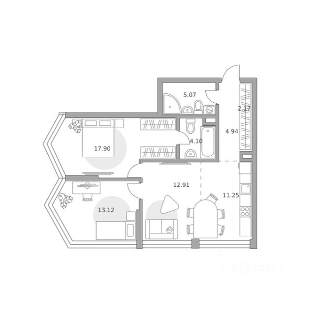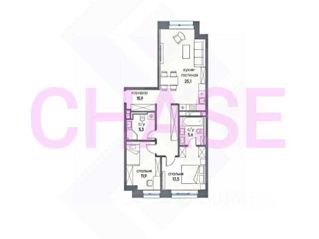 Планировочное решение формата Евро_3 предусматривает: 2е изолированные комнаты по 11,9 - 13,5 м2 и просторная кухня-гостиная 25,1 м2, где зона кухни занимает 5,1 м2 объединённую с гостиной 20 м2.