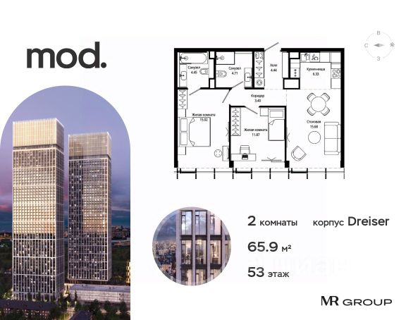 Прямая продажа от застройщика. Продается 2-к квартира общей площадью 64.45 м² с предчистовой отделкой в ЖК премиум-класса Mod на 5-м этаже 44 этажного дома. Mod - жилой комплекс премиум-класса в историческом районе Москвы Марьина Роща. Пятый корпус станет частью единого высотного ансамбля, который поднимается над столицей и очерчивает новый горизонт города. Расположение корпуса Mod.C отличается тем, что виды на юго-запад Москвы не ограничены существующей застройкой. Почти все главные доминанты столицы — как на ладони: от сталинских высоток до небоскрёбов делового центра. Любоваться достопримечательностями будет вдвойне приятнее через панорамные окна. Закрытая территория жилого комплекса, продуманное благоустройство, эксплуатируемые кровли стилобата, образовательный центр с детским садом создают приватное пространство для тихой семейной жизни, а городская площадь с фонтанами, ресторан, супермаркет, коммерческая инфраструктура на первых этажах привносят созвучную с ритмом города динамику. Преимущества проекта: - В шаговой доступности новый деловой кластер Москвы - Выразительная авторская архитектура - Единственные в Москве фасады башен из натурального камня - Панорамное остекление и высота потолков до 4,8 м - Квартиры и апартаменты с отделкой MR Base - Многоуровневое благоустройство с зонированием на закрытой территории - Многофункциональный образовательный детский центр с детским садом - Двухуровневый подземный паркинг Транспортная доступность: - 5 минут пешком до станции метро "Марьина Роща" - 3 минуты до ТТК - 15 минут до Цветного бульвара Компания MR Group предлагает своим клиентам специальные условия приобретения квартир в рамках программ ипотечного кредитования от банков-партнеров. Продам 2-комнатную квартиру первичка на улице 4-я Марьиной рощи в Москве.