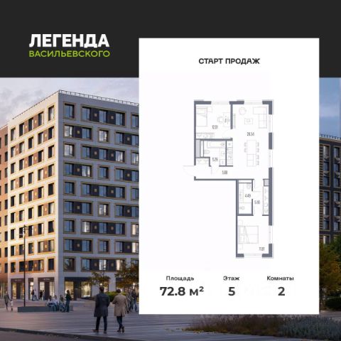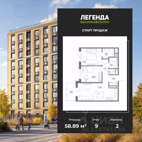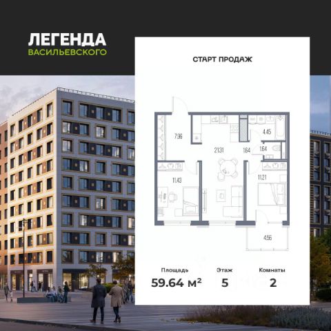Продается 2-комн. квартира от застройщика с предчистовой отделкой в ЖК "ЛЕГЕНДА Васильевского" на 2 этаже. Общая площадь: 60.64 кв.м., жилая: 22.59 кв.м., площадь просторной кухни-столовой: 18.14 кв.м. Комнаты изолированные, все окна выходят на одну сторону. В квартире два совмещенных санузла. Высота потолков 2.72 м. "ЛЕГЕНДА Васильевского" жилой квартал в минутной доступности от Финского залива, главного креативного хаба Санкт-Петербурга Севкабель Порта и других точек притяжения. Современные инженерные и технические решения, повышающие качество жизни TechnoBox включают в себя: стационарный и удаленный контроль дома, систему вентиляции Air Design - здоровое дыхание без лишнего шума, мультисервисную сеть, объединяющую коммуникационные системы, удаленное управление электроприборами, контроль отопления в каждом помещении, поддерживающий оптимальный температурный баланс во время "холодного" периода", датчики протечки, датчик открытия входной двери. Мультисервисная сеть (МСС) объединяет ключевые слаботочные системы дома, задавая им единый высокий стандарт работы, обеспечивая надёжность их функционирования и управления. Квартира готова к декорированию. Застройщиком сделана шумоизоляция; стены подготовлены для отделки; проведена электрика с учетом рекомендаций по расстановке мебели и бытовой техники; выровнен пол. В каждой квартире установлена взломостойкая входная дверь, окна со специальным термоизолированным алюминиевым профилем. Двор жилого комплекса "ЛЕГЕНДА Васильевского" закрыт. Проект состоит из шести разноформатных корпусов с ритмичными фасадами в духе пост-конструктивизма. Геометрия жилого комплекса состоит из четко простроенных осей, чередующих открытые пространства и объемы корпусов, каждый из которых обладает своим визуальным кодом индивидуальным рисунком фасада и цветовой палитрой. Корпуса образуют периметр с общественными пространствами: площадью с кафе, магазинами и пешеходным променадом с детскими игровыми хабами, местами для спокойного отдыха и workout-зоной. На территории комплекса предусмотрены теплый подземный паркинг и два наземных 4-х этажных паркинга.