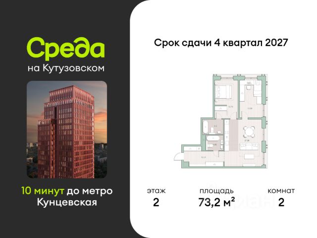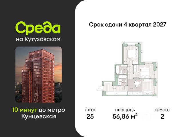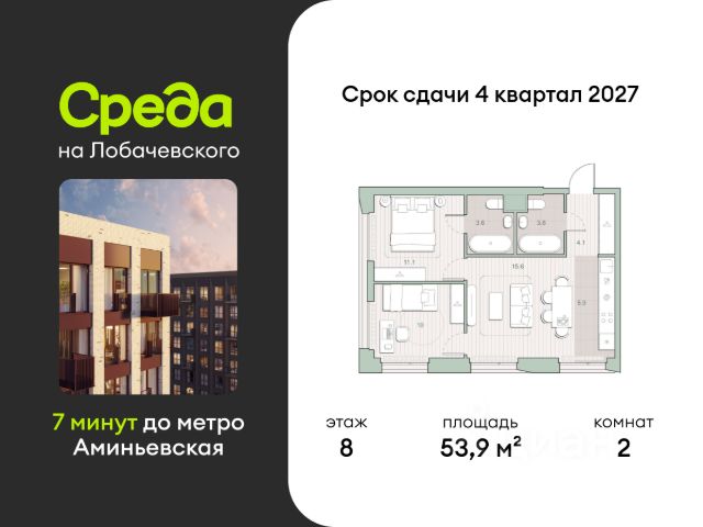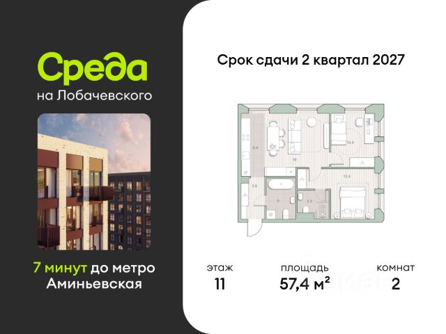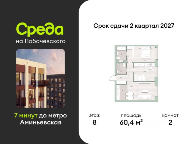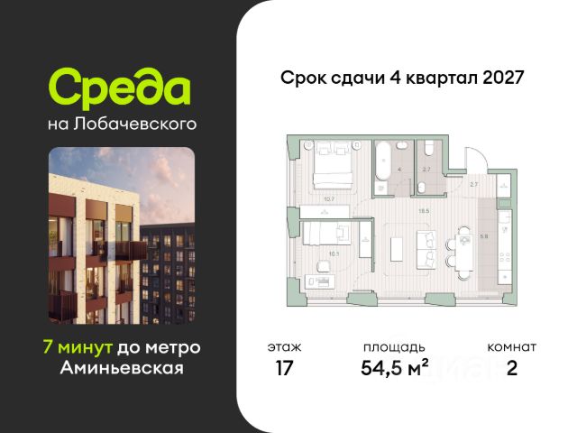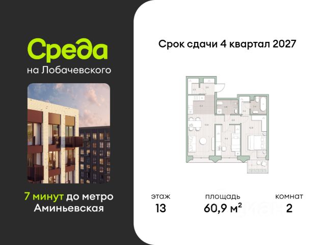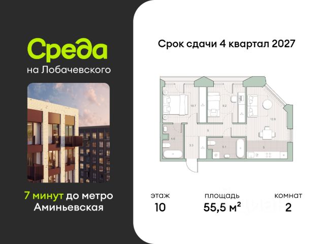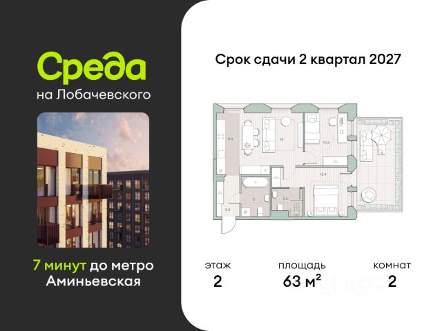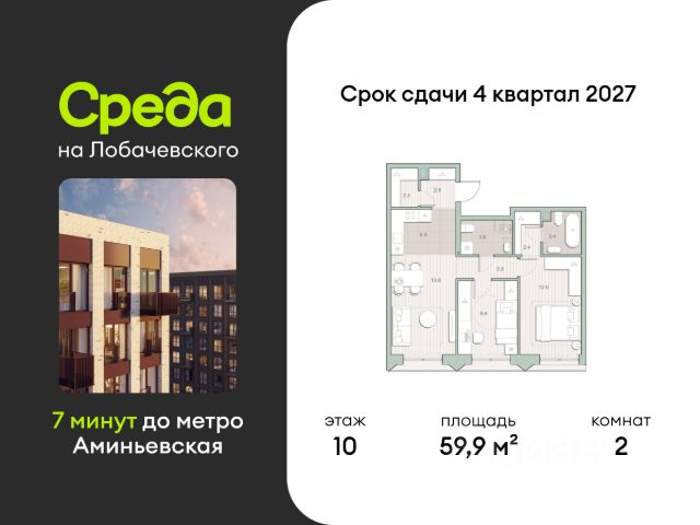 О квартире Продаётся двухкомнатная квартира общей площадью 51.10 кв. м. с отделкой на выбор: черновая, White Box. Квартира на 10 этаже корпуса 5.6 в жилом комплексе бизнес-класса "Среда на Лобачевского". До метро "Аминьевская" 7 минут пешком. Развитый район с удобным выездом "Среда на Лобачевского" строится рядом с Аминьевским и Очаковским шоссе, отсюда можно доехать до МКАД или Ленинского проспекта за 10 минут. В районе уже есть всё для жизни: рестораны, кофейни, торговые центры, поликлиники и спортивные комплексы, школы и сады, бульвары и парки. - 7 минут ходьбы до станции метро "Аминьевская". - 15 минут пешком до станции МЦД-4 "Очаково". - 8-15 минут на машине до Кутузовского проспекта и ТТК. - До 15 минут езды до заказников "Долина реки Сетунь" и "Воробьёвы горы". Акции и спецпредложения - Выгода 12%: если внести 100% оплату или оформить семейную ипотеку под 6%. Действует до 13 апреля. - Низкие ставки по ипотеке: 0,1% в первый год или 0,11% в первые два года кредита. - Трейд-ин от "Среды": можно обменять свою текущую квартиру на новую. - Ипотека для семей с детьми: если ребёнку до 7 лет, предлагаем льготную ставку 3,5% О жилом комплексе "Среда на Лобачевского" - новый квартал в парадном стиле старой Москвы. Благодаря разноэтажной застройке во дворе комплекса будет много света и воздуха, без ощущения замкнутого пространства. Во дворе лаунж-зоны для медитации и работы, площадки для игр и кинопоказов, а на первых этажах - кофейни и магазины. Особенности - Высота потолков 3,24 метра. - Панорамное остекление в пол. - Квартиры с террасами, мастер-спальнями и сквозными планировками. - Дизайнерские гранд-лобби в каждом корпусе. - Ландшафтный парк с зонами отдыха у воды. - Коворкинг на свежем воздухе. - Локации для спорта, игр и приватного отдыха. - Соседский бульвар с площадкой для подростков. - Подземный паркинг с двумя въездами. - Система бесключевого доступа. - Стрит-ритейл на первых этажах.