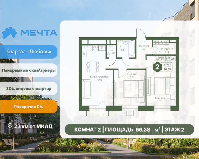 Рассрочка 0% от застройщика! Продается двухкомнатная квартира в квартале "Дружба" жилого комплекса "Мечта". Общая площадь квартиры: 59.54 кв. м, этаж 5 из 5. Срок сдачи: 4 квартал 2027 г. Отделка: Чернова ОСОБЕННОСТИ: - Просторная кухня-гостиная - Продуманная планировка - Широкоформатные окна - 2 спальни - 2 санузла - Высота потолка: 2.7 метра Квартал "Дружба" состоит из пяти пятиэтажных домов с несколькими подъездами. Каждый дом оборудован широкими окнами, которые обеспечивают максимальный доступ естественного света и открывают прекрасный вид на окружающую природу. Квартал отличается большими застеклёнными лоджиями, которые позволяют наслаждаться свежим воздухом и красивым видом, не покидая своего жилища. Жилой комплекс "Мечта" расположен в 23 км от МКАД по Дмитровскому или Ленинградскому шоссе. ТРАНСПОРТНАЯ ДОСТУПНОСТЬ: - 15-20 минут на общественном транспорте до МЦД-1 "Лобня" - 30-35 минут на общественном транспорте до метро "Физтех" - 45-50 минут до станций метро "Савеловская" или "Белорусская" - 30 минут на автомобиле до Москвы Инфраструктура включает в себя муниципальную школу и детские сады, кабинет врача общей практики, множество кафе и ресторанов, а также различные спортивные и детские площадки. В пешей доступности от жилого комплекса расположены лес и три реликтовых озера — Долгое, Круглое и Нерское, а также реки Альба, Уча и Волгуша. Территория жилого комплекса закрыта для посторонних, находится под охраной и патрулируется. На въезде расположен КПП. Камеры видеонаблюдения работают круглосуточно на всей территории. Вы и ваши дети будете чувствовать себя в безопасности.