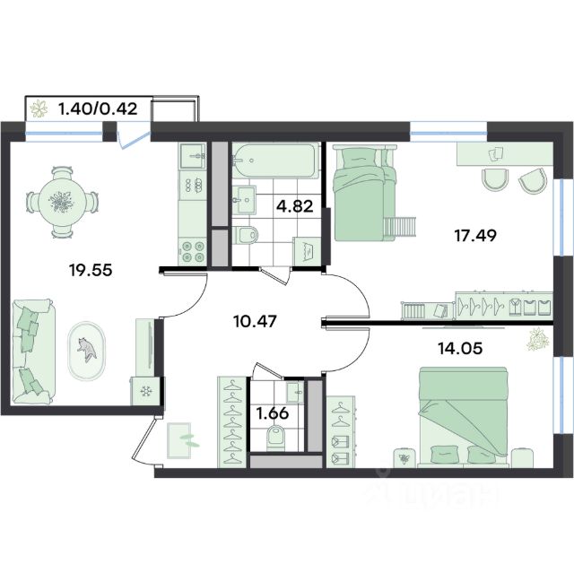 Продаётся 2-комнатная квартира в строящемся доме (Театральный, к2), срок сдачи: II-кв. 2026, общей площадью 55.9 кв.м., на 2 этаже. Бутик-квартал "G3 Театральный"