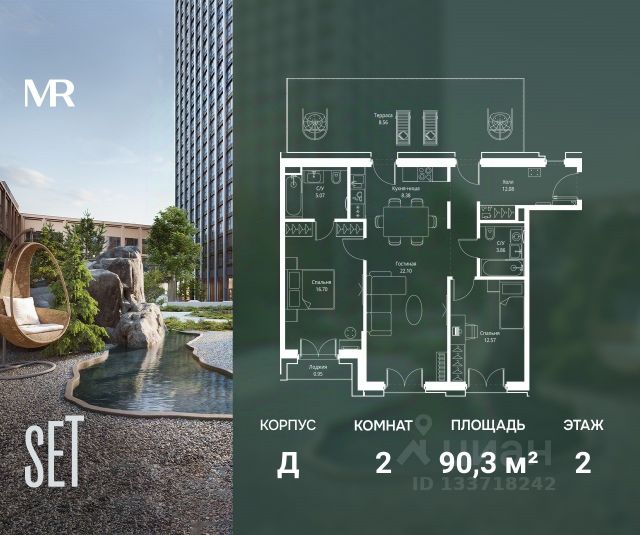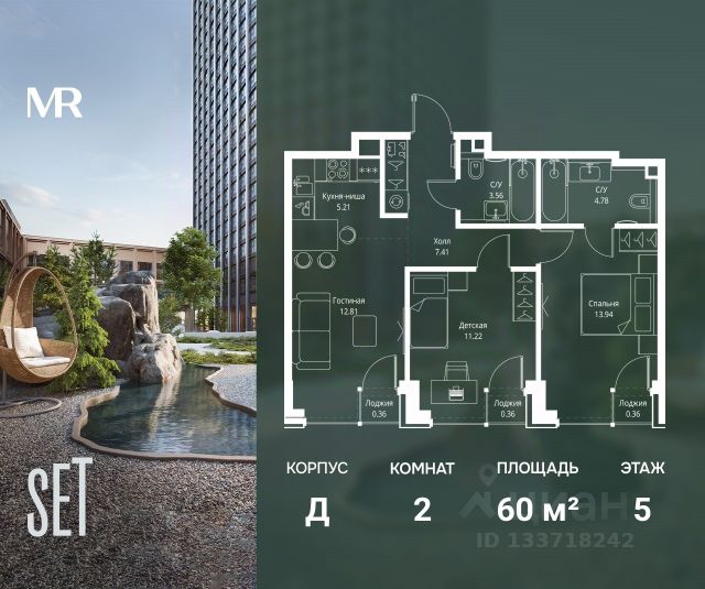 Прямая продажа от застройщика. В ЖК SET продается 2-комнатная квартира площадью 60.01 м², расположенная в корпусе Д, на 5 этаже 5 этажного дома. SET имеет стратегически выгодное расположение в ЗАО, в районе с большой историей и блестящим будущим: между природной зоной долины реки Сетунь и Кутузовским проспектом. В рамках возведения первой очереди предусмотрено три корпуса высотой 18, 45 и 59 этажей. На верхних этажах спроектированы общедоступные смотровые площадки с панорамным обзором на центр столицы. Преимущества проекта: • Функциональные планировочные решения • Контроль проникновения через входную дверь • Система управления освещением и температурой в квартире • Система защиты от протечек с функцией перекрытия воды • Вход в подъезд по биометрическим считывателям Face ID • Скоростные лифты • Двухуровневый подземный охраняемый паркинг на 495 машино-мест Застройка SET включает в себя не только жилые корпуса, но и инфраструктурные объекты. Все необходимое для повседневного комфорта будет расположено в шаговой доступности: • Фитнес-клуб с бассейном • Ведущая городская школа, детский сад и школа искусств • Центр культуры и досуга • Медицинский центр • Кафе и рестораны Расположение комплекса: Пешком: • Метро "Давыдково" - 17 минут • Парк "Долина реки Сетунь" - 3 минуты • Открытие новых станций метро в шаговой доступности в будущем Инфраструктура: Разнообразить свой день резиденты VEER смогут также проводя больше времени на свежем воздухе. Двор разделен на 4 зоны разных эмоций и действий, которые пересечены и соединены веерными прогулочными маршрутами: • Спортивная площадка устроена в глубине ""Кленовой рощи"" • В ""Чайном домике"" будет создан навес с утеплением для отдыха в любую погоду • Площадки для детей воплотятся в ""Волшебный лес"" с цветами, зеркалами и световым дизайном • ""Центральная площадь"" устроена у водного оазиса живописного пруда. " На машине: • "Москва-Сити" - 15 минут • Садовое кольцо - 20 минут • ТЦ "Океания" - 8 минут • ТЦ "Времена года" - 13 минут • Сколково - 12 минут • Гребной канал - 17 минут Компания MR предлагает своим клиентам специальные условия приобретения квартир в рамках программ ипотечного кредитования от банков-партнеров.