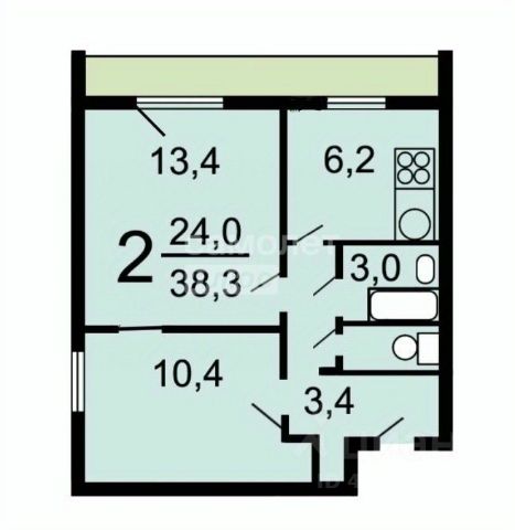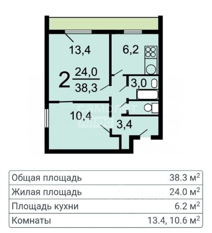 Общая площадь: 38,3 м²; жилая: 24 м²; кухня: 6,2 м².