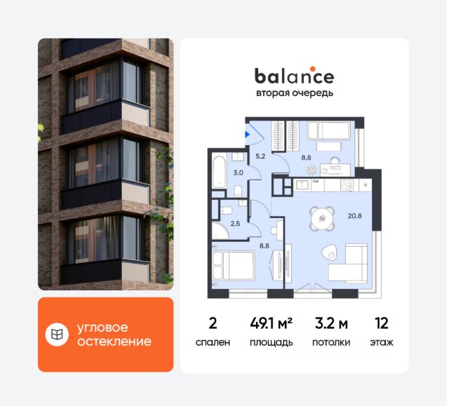 Общая жилая площадь составляет 32,2 квадратных метра, кухня — 8,8 квадратных метров. Особенностью квартиры является просторный балкон, выходящий на две комнаты, который может стать уютным местом для отдыха.