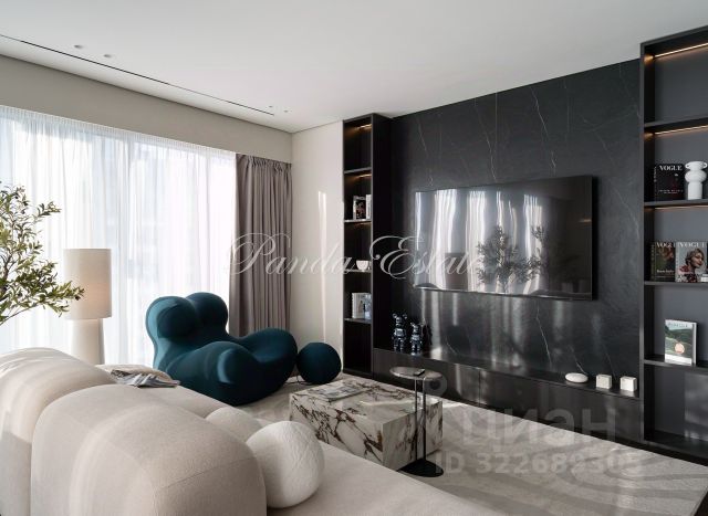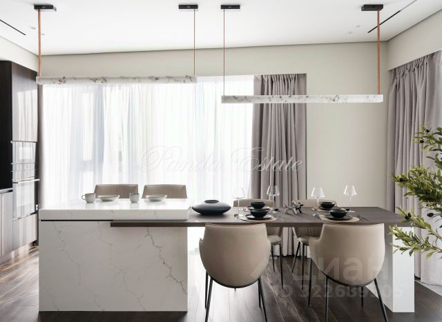 - кухня-гостиная обладает наиболее теплой атмосферой, это создается благодаря локальному, дизайнерскому освещению и оформлению, выполненного в спокойной цветовой гамме. В зоне кухни имеется вся встроенная техника, уже являющаяся стандартом в данном сегменте, а так же оснащена достаточное количество мест хранения. В зоне гостиной установлен диван для комфортного времяпрепровождения с друзьями, коллегами или же собственного. Под телевизором имеется подвесная тумба, позволяющая разместить дополнительное звуковое/игровое оборудование, а так же декор. Вместительные ящики можно использовать под любое назначение;