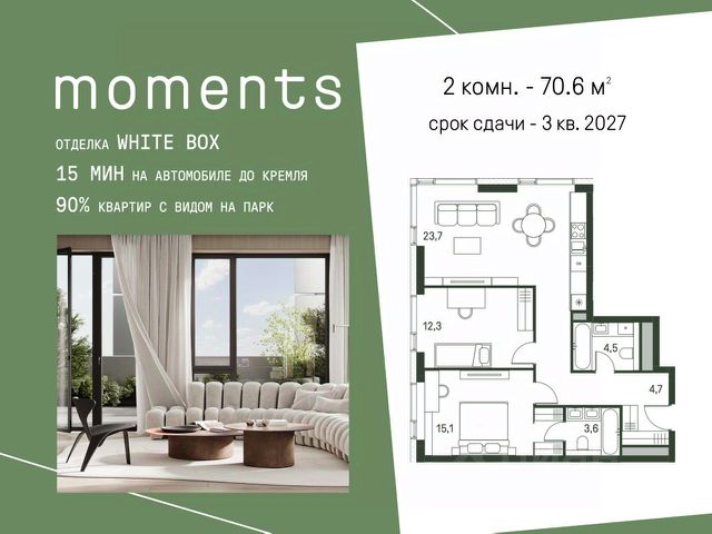 Стоимость указана с учетом скидки 9%, ваша выгода составит 3 898 368 рублей! Полная стоимость квартиры без скидки 43 315 200 рублей. В продаже 2-комнатная квартира в готовом клубном доме бизнес-класса "Интонация". Квартира с высокими потолками с мастер-спальней, просторной кухней и постирочной. Условия покупки: - выгода до 3,9 млн - семейная ипотека - рассрочка на 6 месяцев - Trade-in "Интонация" состоит из двух 21-этажных корпусов и приватной внутренней территории. На стилобате расположен ландшафтный сад с авторским благоустройством. В продаже финальный пул квартир бизнес-класса с мастер-спальнями, возможностью установки камина, окнами в ванных комнатах, увеличенной высотой потолков, а также просторными террасами и лоджиями. "Интонация" расположена в экологичном районе Щукино на северо-западе Москвы. Вокруг Щукинский лесопарк, Всехсвятская роща и парк "Покровское-Стрешнево". Одно из главных преимуществ дома - сочетание близости к природе и развитой инфраструктуры: - до метро "Щукинская" - 10 минут пешком - до центра - 10 минут на автомобиле Рядом детские сады и школы, включая знаменитую Курчатовскую. Недалеко расположены корпуса Финансового университета и других ведущих вузов. В пешей доступности - поликлиники, супермаркеты, фитнес-центры и спортивные секции. Собственная инфраструктура "Интонации" - ресторан итальянской кухни, студия фитнеса и пилатеса, супермаркеты, один из которых круглосуточный, салон красоты, барбершоп и химчистка. Приватная территория "Интонации" разделена на две тематические зоны: внутренний двор с детскими и спортивными площадками и ландшафтный сад на террасе. Главным акцентом стал парящий водоем с подвижной гладью. Двухуровневый паркинг рассчитан на 186 автомобилей и 27 гостевых мест. Есть возможность зарядки электромобилей, удобный подъезд для грузового транспорта, келлеры для хранения личных вещей и помещение для велосипедов.