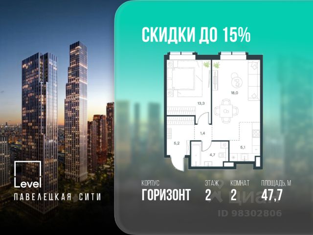 В Даниловском районе столицы (ЮАО) продаётся 2-комнатная квартира площадью 45.00 кв.м без отделки. Квартира расположена на 10 этаже 20-этажного корпуса 'Горизонт' в жилом комплексе бизнес-класса Павелецкая Сити. Высота потолков 3.00м. Престижная локация "Павелецкая Сити" - жилой комплекс бизнес-класса, расположенный в престижном Даниловском районе Москвы, на границе с ЦАО. Проект находится в историческом центре города в окружении парков, Москвы-реки и сформированной инфраструктуры. В пределах 20 минут пешком есть 3 станции метро, а в 5 минутах езды на авто - ТТК и Садовое кольцо. - 15 мин. пешком до метро "Павелецкая"; - 20 мин. пешком до станций "Тульская" и "Серпуховская"; - 8 мин. на авто до Кремля; - 10 мин. на авто до парка Горького и парка "Зарядье"; - 20 мин. на авто до башен "Москва-Сити". Авторская архитектура Архитектурная концепция разработана бюро СПИЧ по индивидуальному проекту. Облик корпусов I и II очередей отсылает к стилистике архитектуры классического Нью-Йорка и золотой эпохи Голливуда. Корпуса IV очереди вдохновлён эстетикой ар-деко в её современном переосмыслении. Благодаря линейному расположению корпусов из большинства квартир будут открываться потрясающие виды на исторический центр города и Москву-реку. Дизайнерские лобби Изысканные интерьеры лобби жилого комплекса отсылают к классическим фильмам золотой эпохи Голливуда. Классика в "Павелецкая Сити" - не имитация, а современное осмысление лучшего в этом стиле. В каждом вестибюле оборудованы стойки ресепшен, комфортные зоны ожидания, гостевые санузлы, мойки для лап животных, колясочные. В корпусах по 3-4 лифта, включая сервисный, с прямым доступом в паркинг. Площадь лобби - от 47,9 до 114,9 кв. м, высота потолков - до 5,46 м. Благоустройство и инфраструктура Для создания благоустройства было приглашено 2 ведущих бюро - ADM и GAFA. Разноуровневое пространство вмещает всё необходимое для качественного досуга: игровые площадки для детей всех возрастов, тропы здоровья для пеших прогулок, крытые аллеи с качелями, места для работы на свежем воздухе, многофункциональные спортивные площадки - воркаут-зоны, столы для пинг-понга, зоны командных игр. Общая площадь закрытого двора - 4,63 га. Комфорт - это когда рядом всё, что нужно для жизни. На первых этажах и в стилобатной части корпусов "Павелецкая Сити" размещены 85 коммерческих помещений, где откроются супермаркеты, кафе, пекарни, аптеки и другие службы сервиса. В составе проекта также предусмотрены собственный фитнес-клуб и развивающий центр Letovo Kids, а также школа на 720 мест и детский сад на 175 мест. Технологии и безопасность - Wi-Fi в лобби и на придомовой территории; - Автоматизированная система контроля и учета ресурсов; - Круглосуточное видеонаблюдение и охрана; - Круглосуточная связь с охраной через приложение, телефон или кол-центр; - Контроль доступа по биометрической системе Face-ID; - Усиленный сотовый сигнал в лифтах и паркинге; - Распознавание номеров автомобилей при въезде/выезде в/из паркинга.