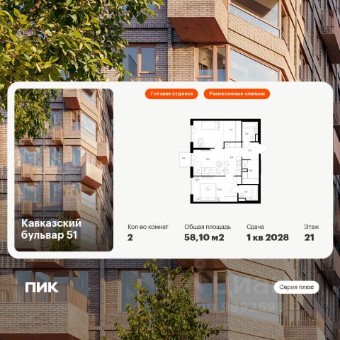 Продаётся 2-комн. квартира площадью 54,4 кв.м на 22 этаже 23 этажного дома (Корпус 3.1, Секция 1) проекта ПИК Кавказский бульвар 51. Светлый просторный подъезд на уровне земли, функциональная планировка, большие окна, c отделкой. "Кавказский бульвар 51" — современный жилой квартал в районе Царицыно. Проект частично реализован. "Кавказский бульвар 51" находится в районе Царицыно, недалеко от одноимённого музея-заповедника. До метро "Кантемировская" — 17 минут пешком. За 20 можно дойти до станции "Чертаново". В 10 минутах на машине — МКАД, в 11 минутах — Варшавское шоссе, а в 16 минутах — ТТК. В проекте жилые дома высотой от 5 до 33 этажей, детский сад и школа. На первых этажах доступны магазины, кафе, салоны красоты и другие сервисы — чтобы купить кофе и свежий хлеб к завтраку, можно просто спуститься на лифте. В уютных дворах-парках есть места для отдыха и детские площадки. Для прогулок на свежем воздухе мы построим для жителей широкий пешеходный бульвар. В районе вокруг "Кавказского бульвара 51" есть всё для комфортной жизни: детские сады, школы, поликлиники, магазины и торговые центры. Девять минут на машине — и вы у музея-заповедника "Царицыно", где можно гулять среди исторических построек, лежать на траве под тенью деревьев или заниматься спортом на специальных площадках. Есть парки и поближе: до Аршиновского можно дойти за 8 минут, а до парка "Сосенки" — за 13 минут. Артикул 1009540 (Застройщик АО "СПЕЦИАЛИЗИРОВАННЫЙ ЗАСТРОЙЩИК "ТОРГОВЫЙ ДОМ СПУТНИК")