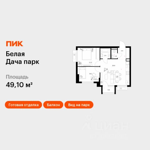 Продаётся 2-комн. квартира площадью 49,1 кв.м на 9 этаже 11 этажного дома (Корпус 16.2, Секция 8) проекта ПИК Белая Дача парк. Светлый просторный подъезд на уровне земли, функциональная планировка, большие окна, c отделкой. "Белая Дача парк" — новый проект в Московской области, в городе Котельники. Квартал расположен в 2 километрах от МКАД и в 7 минутах на автомобиле от метро "Котельники". Уже сейчас вы можете приобрести квартиры с отделкой в готовых и строящихся корпусах. На территории квартала будут построены 22 дома, две школы, поликлиники и пять детских садов. Один из центральных элементов проекта — широкий пешеходный бульвар, где мы создали пространства для спорта, прогулок и отдыха. Яркой точкой притяжения стал ПлейХаб "Ферма" — масштабная игровая зона с домом-мельницей, искусственным ручьём и развивающими элементами для детей. В 2024 году ПлейХаб стал победителем "Всероссийской премии лучших проектов создания игровой среды" и получил награду "Лучшая реализация игровой площадки среди девелоперских проектов". Рядом с кварталом много магазинов и развлекательных центров: "МЕГА Белая дача" и гипермаркет "Глобус". До Люберецких карьеров можно добраться на машине за 9 минут, а до парка "Кузьминки" — за полчаса. Артикул 1009033 (Застройщик АО "СЗ "Новый Горизонт")