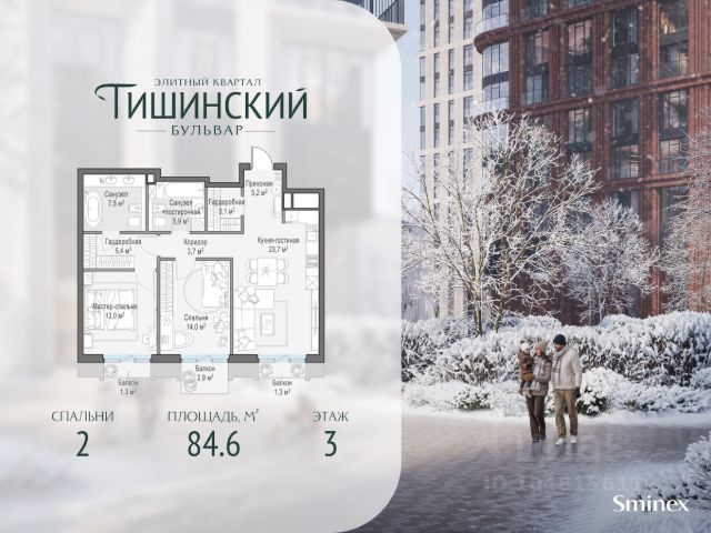 В продаже 2-комнатная квартира квартира в элитном квартале "Тишинский бульвар". Общая площадь квартиры - 84.60 кв.м. Этаж 3 из 7. Корпус К5С3. "Тишинский бульвар" - тихий зелёный элитный квартал на Тишинке, в престижном и комфортном районе центра Москвы. В нём создан уникальный для элитного дома прогулочный бульвар в своём огромном парке 1,9 га. В парке оборудованы зоны для активного и тихого отдыха, крытые галереи, приватные зелёные комнаты, многофункциональная спортивная площадка, воркаут-зона, детская площадка, сухой фонтан, ручей. В пешей доступности Римско-католический кафедральный собор. Всего в полутора километрах от квартала находятся Патриаршие пруды - излюбленное место для летних прогулок, воскресных бранчей и романтических ужинов. Белая площадь расположена ещё ближе - на расстоянии 1,2 километра. Это точка концентрации деловой жизни и модных ресторанов. В "Тишинский бульваре" только для жителей и их гостей создан уникальный для элитного дома прогулочный бульвар в собственном огромном парке площадью 2,1 га, который занимает 70% территории квартала. Бульвар проходит через весь квартал и объединяет в общее пространство три двора: Кленовый, Рябиновый и Ивовый. В парке созданы крытые галереи и приватные зелёные комнаты для отдыха и медитаций в любую погоду. Насыщенное озеленение многолетними растениями с разными периодами цветения сохраняет территорию квартала красивой круглый год. В квартале насыщенная инфраструктура только для жителей, включая Clubhouse. Здесь оборудованы пространства для здорового образа жизни по стандарту FIT LAB: в парке - многофункциональная спортивная площадка, воркаут-зона, место для занятий йогой и медитации; бесплатный фитнес-клуб с бассейном. Для маленьких жителей доступны детская площадка и игровая комната по стандарту KIDS LAB. Дома оснащены самыми полными и лучшими системами.