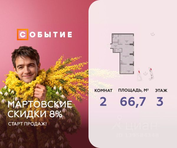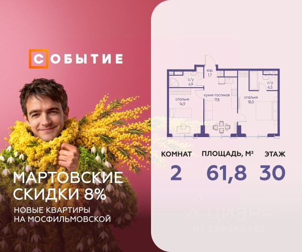 Весь март - скидка до 8% действует до 31.03.2026 г. при 100% оплате и не субсидированной ипотеке! В продаже 2-к квартира от застройщика. Общая площадь 61.4, жилая 44.5, кухня 16.9. Квартира расположена на 8 этаже жилого квартала "Событие-6", корпус 2, Секция 3. Квартира без отделки. Срок сдачи: 4 кв. 2029 года. СОБЫТИЕ.6 — финальный дом парк-квартала СОБЫТИЕ на Мосфильмовской. Переезжайте в уже сформированный квартал с готовой инфраструктурой и парком! Премиальный жилой комплекс в престижном районе Москвы предлагает стильную архитектуру, продуманное благоустройство и великолепно разнообразие общественных пространств. Свой парк прямо возле дома! Архитектура Архитектура СОБЫТИЯ.6 выполнена в ультрасовременном стиле московским бюро Atrium на основе дизайн-кода британских архитекторов LDA Design и UHA London. Дом отличает оригинальная геометрия фасадов, большое остекление и высокие лобби (до 6,2 м) с авторской мебелью и светильниками. Расположение Мосфильмовская улица (Раменки) — один из престижных районов Москвы. Близость к историческому и деловому центру, природным зонам Запада столицы. Транспортная доступность: • 10 мин до Москва-Сити и ТТК; • 15 мин до Садового кольца; • 25 мин до аэропорта Внуково; • 7-10 мин до станций метро "Аминьевская" и "Мичуринский проспект". Инфраструктура: • парк "Событие" (12 га, финалист конкурса Правительства Москвы) с беговыми (1,5 км) и велодорожками (2,7 км), экотропой (1,6 км), площадками, лекторием; • школа, детский сад, магазины, салоны красоты, рестораны (к моменту заселения); • мультидвор с игровыми и спортивными площадками, мини-бульваром; • общественная терраса на 10-м этаже (коворкинг, лаунж); • Закрытые общественные пространства: детская комната, спортивный зал, коворкинг, лаунж-зоны. Паркинг 256 мест для жителей (48 — для электромобилей), 24 гостевых (5 — для электромобилей), мойки колес, кладовые, зоны для велосипедов. Окружение Парки и заповедники (Воробьёвы горы, Матвеевский лес и др.), МГУ, театр им. Н. И. Сац, стадион "Лужники". Безопасность Видеонаблюдение, контроль доступа, видеодомофоны, консьерж-сервис 24/7, системы пожарной безопасности и мультисервисная оптическая сеть.