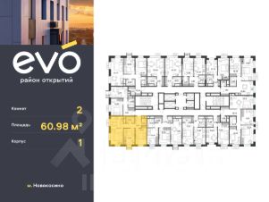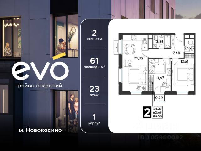Продается двухкомнатная квартира 60.98 кв.м. в жилом комплексе EVO на 23 этаже по адресу: Московская область, г. Реутов, ул. Комсомольская. EVO - проект комфорт-класса от девелопера Dogma. Каждый житель сможет открыть для себя максимум возможностей. Совершенствоваться во всех направлениях: физическом, эмоциональном и материальном. В EVO можно открыть для себя новые виды спорта, найти единомышленников по хобби, партнеров по бизнесу, развивать в детях новые грани, наслаждаться природой и лаконичной архитектурой. Безопасность - Закрытая территория - Круглосуточное видеонаблюдение - Контроль доступа Расположение Пешком - 7 минут до станции Реутов - 20 минут до метро Новокосино На машине - 4 минуты до МКАД - 6 минут до шоссе Энтузиастов - 9 минут до Носовихинское шоссе - 13 минут до МСД (Московский скоростной диаметр) Более 6 га благоустройства в первой очереди - Зеленый двор без машин, кленовая аллея для прогулок - Нейродинамические площадки для детей разных возрастов - Workout зона, столы для пинг-понга, места для занятия йогой. велодорожки и дорожки для скандинавской ходьбы - Детский сад на 180 мест и школа на 750 мест - Кроссбукинг - Лобби с зоной ожидания, колясочной и лапомойкой - Магазины и кафе на первых этажах Окружение - Реутовский центральный парк, Александровский сквер, Фабричный пруд - ТЦ "Экватор", ТК "Шоколад" - Спортивный комплекс "Старт", Ледовый комплекс "Реутов Арена" - Музей-усадьба "Кусково" Социальная инфраструктура В первой очереди предусмотрено строительство детского сада на 180 мест и школы на 750 учащихся. В 10 минутах ходьбы от EVO находится детский технопарк "Изобретариум", в котором более 60 научных секции: от IT до промышленного дизайна. Для творческих ребят рядом есть художественная и музыкальные школы, хоровая студия.
