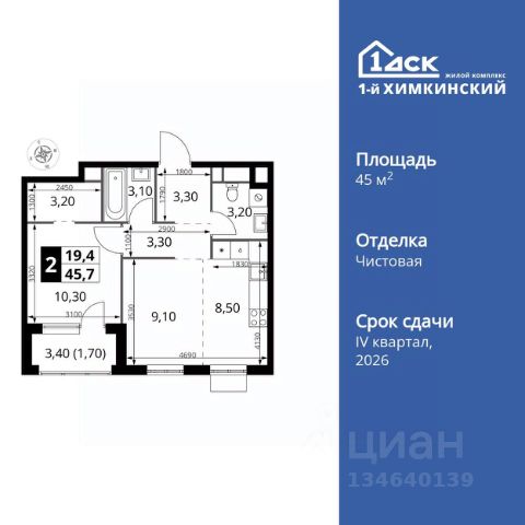 Прямая продажа от застройщика! Жилой Комплекс класса Комфорт. Продаётся 2-к квартира номер 400 общей площадью 45.7 кв.м. на 4-м этаже 7 этажного здания. Чистовая отделка. Особенности квартиры: - Мастер-зона с гардеробной. Просторное место для отдыха и удобного хранения вещей. - Просторная спальня, в которой можно разместить большую кровать. - Линейная планировка - максимальная функциональность и удобство. - Раздельный санузел - больше удобства для всех членов семьи. - Евроформат - просторное и удобное жилье с отличной планировкой. - Гардеробная - удобство для хранения и организации вещей. - Ниша под шкаф - компактное и удобное место для вещей. - Лоджия - уютное место для отдыха и тишины. Информация о комплексе: Квартал класса комфорт плюс, где современное городское пространство граничит с удивительной природой вокруг. 1-й Химкинский расположен на территории в 102 га и органично вписан в природное окружение Химкинского леса и канала им. Москвы. В проекте предусмотрена богатая коммерческая инфраструктура с собственным торговым центром, общеобразовательные учреждения и социальные объекты. Изюминкой жилого комплекса будут спортивно-оздоровительный комплекс с термами и SPA и семейный парк развлечений. Транспортная доступность: ЖК "1-й Химкинский" дает возможность выбрать любой способ передвижения как до города, так и до самых разных объектов, которые могут представлять интерес для его жителей. Не важно, какой способ передвижения вы предпочитаете, успевать всегда и везде можно вне зависимости от выбора транспорта. - 8 мин. пешком (800 м) до остановки "Золотая Арка" -10 мин пешком (1 км) до остановки "Поворот на Ивакино" Внутренняя инфраструктура: - Безопасность: закрытые дворы без машин, безбарьерная среда и сквозные подъезды, камеры на детских площадках с возможностью трансляции на смартфоне - Идеальный отдых в кругу семьи: семейный парк развлечений на территории, торговый центр (2-х этажный) общей площадью более 8 тыс. кв. м с фудкортом - Образование: 3 детских сада и современная муниципальная школа на 2450 мест - Спортивная среда: закольцованный веломаршрут с навигацией, спортивный комплекс с термами, закрытый тренажерный зал и зоны ворк-аута - Социальные объекты: поликлиника со станцией скорой помощи, пожарное депо - Подземный паркинг и кладовые помещения на -1 этаже, станция техобслуживания и автомойка на территории