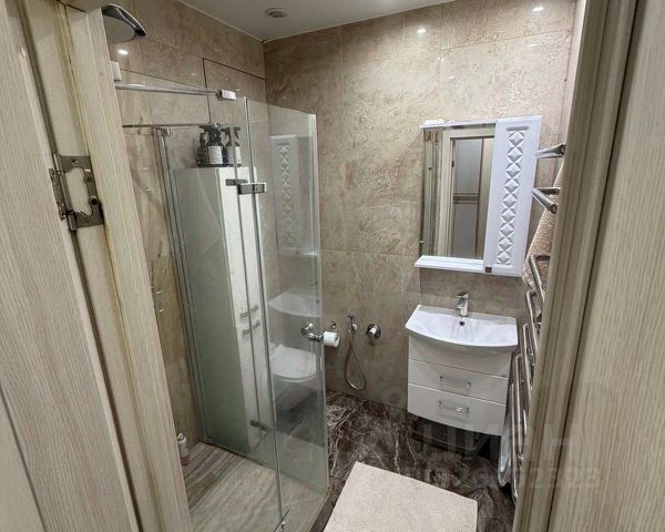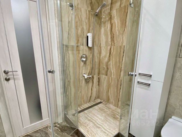 Премиальная ванная комната, где предусмотрена постирочная зона. Установлены двери с увеличенной высотой, что придает квартире больше пространства и торжественности.