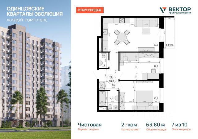 Указанная акционная стоимость доступна при 100% оплате или ипотеке без субсидирования. Цена действует до 01.05.2026 23:59:00. Стоимость без акции 17006000. Продаётся квартира с 2 комнатами общей площадью 44.00 кв. метров на 6 этаже жилого квартала комфорт-класса "Равновесие". На территории комплекса будет возведен детский сад на 360 мест, а на первых этажах жилых домов откроются кафе, магазины и все необходимое для удобства жителей. Локация "Равновесия" выделяется среди других пригородных ЖК разнообразием быстрых маршрутов до Москвы. Для автомобилистов преимуществом станут удобные выезды на Можайское шоссе, Рублёво-Успенское шоссе, Минское шоссе с платной трассой и другие. Также в пешей доступности находятся две ж/д станции — "Жаворонки" и "Здравница". Дорога на электропоезде до делового центра "Москва-Сити" составит всего 35 минут. Особенности ЖК: - Малоэтажная застройка: 4-6 этажей; - Благоустроенный пешеходный бульвар; - Пространства для отдыха и спорта; - Квартиры с террасами на последних этажах; - Квартиры с отдельным входом на первых этажах; - Внутренняя территория квартала свободна от машин; - Безбарьерная среда; - Помещения для хранения детских колясок и спортивного инвентаря.