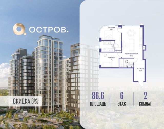 Остров 2-шесть современных корпусов с выразительными фасадами и панорамным остеклением созданы по дизайну бюро LDA Design. Роскошные лобби, подземный паркинг с электро-зарядками, келлерами, местами хранения для велосипедов. Коворкинги ,детский клуб, места для отдыха, фитнес зал , боксы для посылок и заказов . Центральный двор с фантастическим ландшафтным дизайном площадью 5,8 га с собственным ручьём , холмами, уникальными растениями , прогулочными дорожками и местами отдыха, детскими и спортивными площадками.