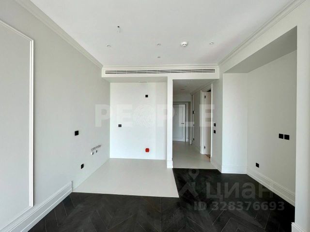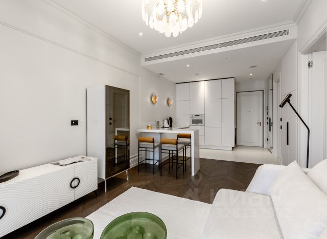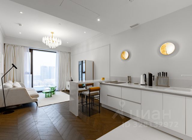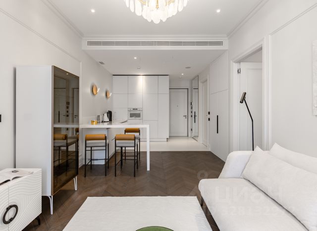 Кровать с высоким мягким изголовьем оборудована подъемным механизмом, позволяющим с удобством использовать место под кроватью в качестве дополнительной зоны хранения. Гардеробная позволит свободно разместить одежду и обувь, а также выделить хозяйственную зону для пылесоса, гладильной доски, чемоданов и других крупногабаритных предметов. Гостиная комната с удобным раскладным диваном. В каждой комнате установлен кондиционер. Интерьер построен на сочетании классических и современных элементов. Классические акцентные молдинги на стенах перекликаются с современными формами мебели, создавая уникальный и сбалансированный образ. Плавные линии, округлые формы и лаконичный декор сделали пространство мягким, уютным и живым. Продуманная подсветка — особенно за зеркалами — помогает акцентировать внимание на текстурах и зонах, создавая мягкую и уютную атмосферу. Ламинат с текстурой натурального дерева выложен единым полотном, что визуально увеличивает пространство и связывает весь интерьер в единую композицию.